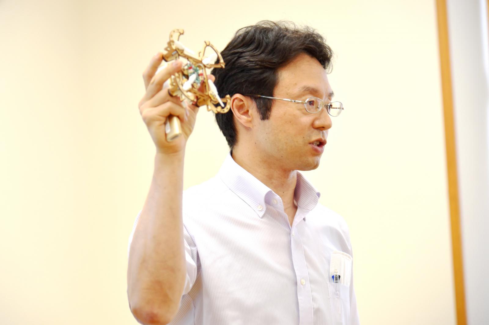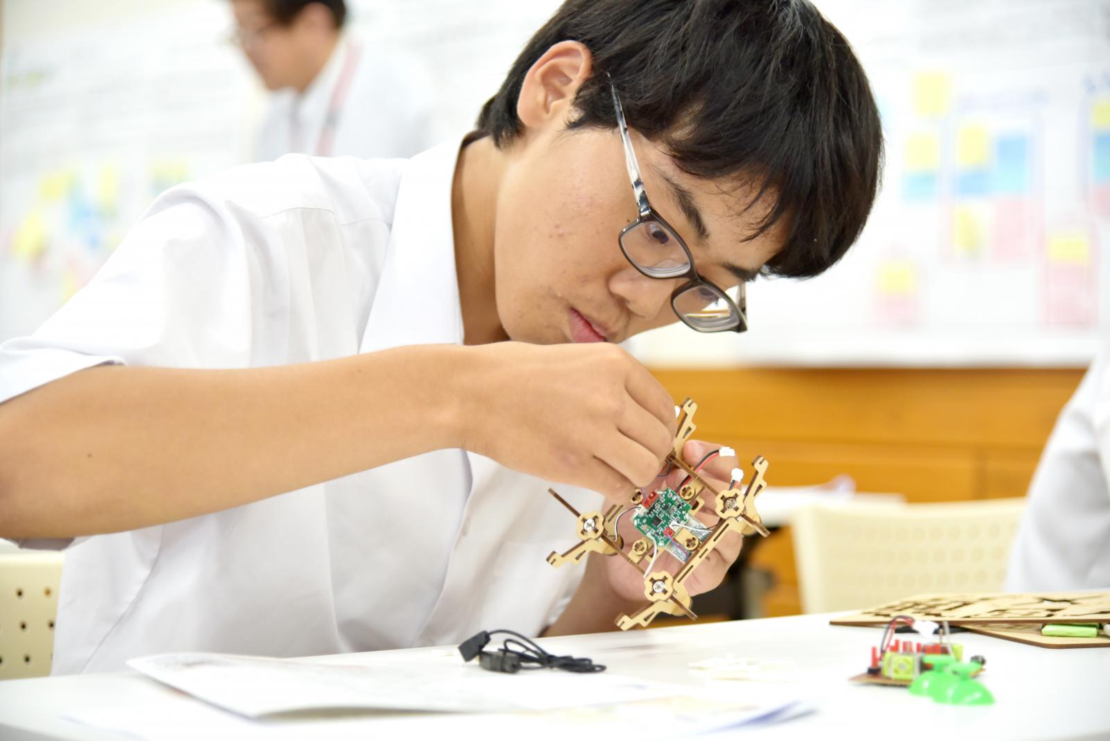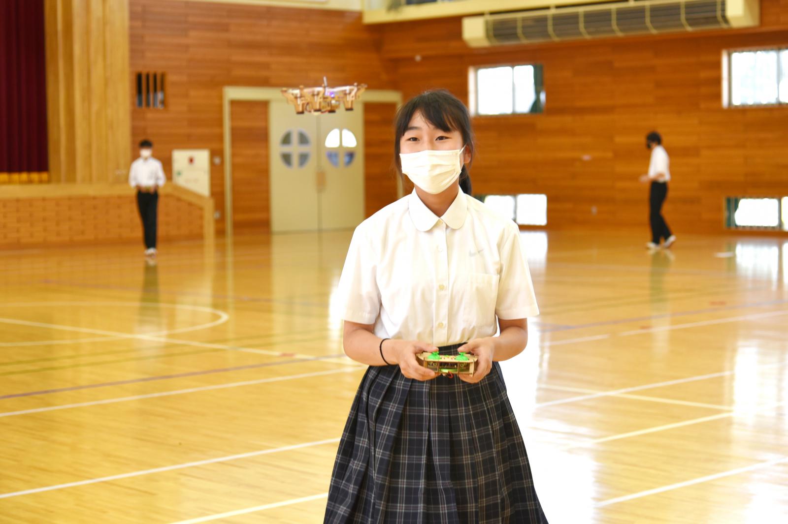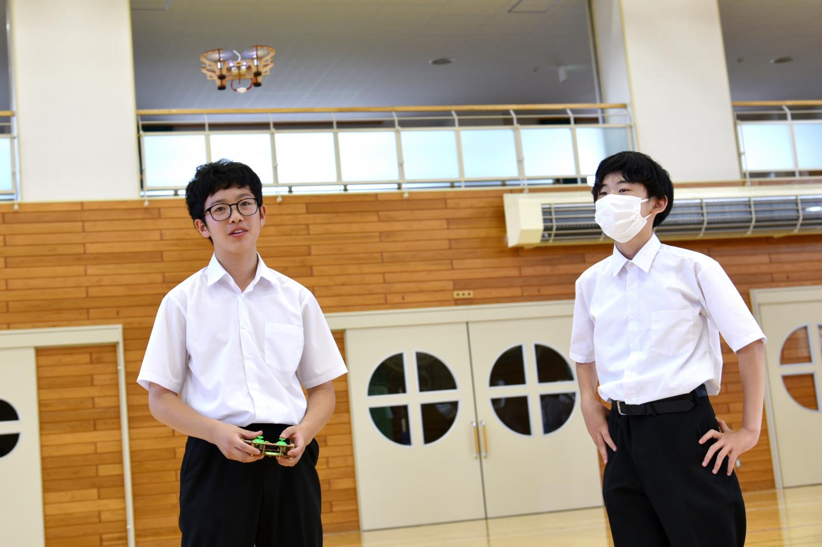 講師:情報工学科 寺田 裕樹 准教授[専門:電子・電気材料工学]ドローンとは何なのか、ドローンが飛ぶ仕組み、ドローンの活用方法などについて座学で学んだ後に、市販の簡単なキット(クアッドコプターと呼ばれる手のひらサイズ(重量:60g)のドローンを組み立て、実際に飛ばしてみることで、体験的にドローンの飛行原理を理解しました。中学生は、ドローンを自由自在に操縦し、着地に成功すると、「ヤッター!!ヤッター!!」と、大喜びする光景が見られました。