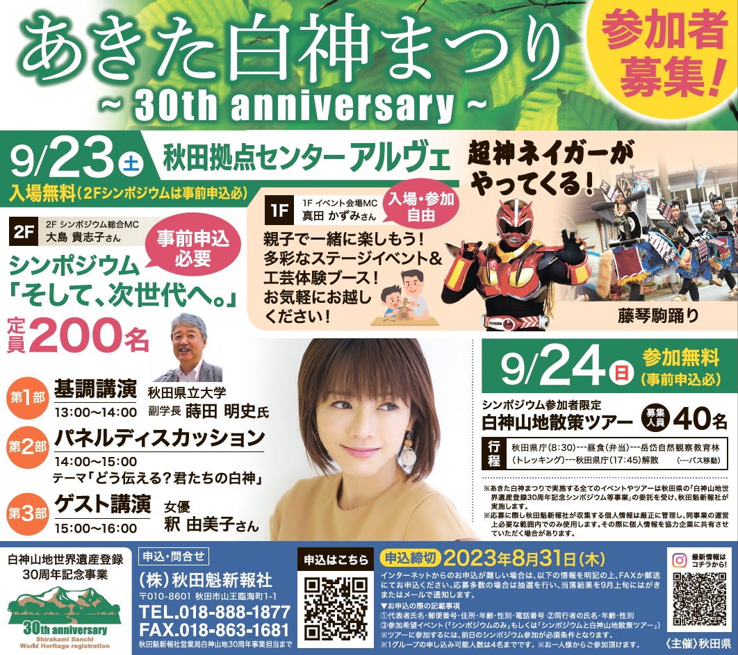 本学の蒔田 明史理事兼副学長[専門:森林生態学]が講演する、白神山地世界遺産登録30周年記念イベント「あきた白神まつり ~30th anniversary~」が、9月23日(土)、秋田拠点センター アルヴェを会場に開催されます。