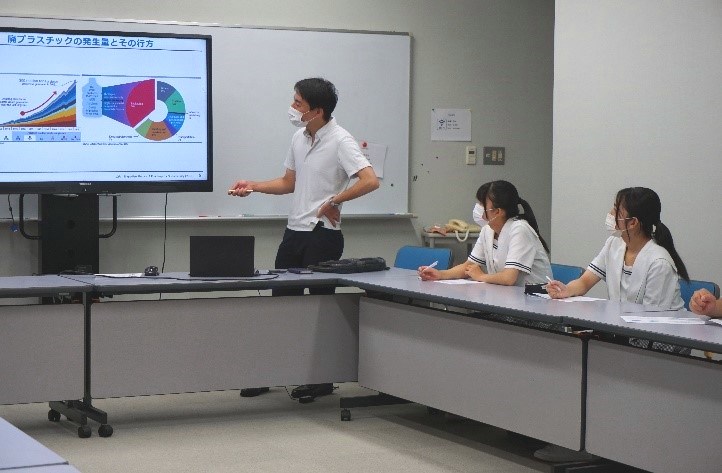機械工学科 境 英一 准教授のコースでは「植物繊維/バイオマスプラスチック複合材料」について作製から性能評価までの一連の研究の流れを実験を交えながら体験しました。実際に大きな実験器具を見たり、触れたり、先生や学生からの話を聞いたりしながら熱心に取り組みました。