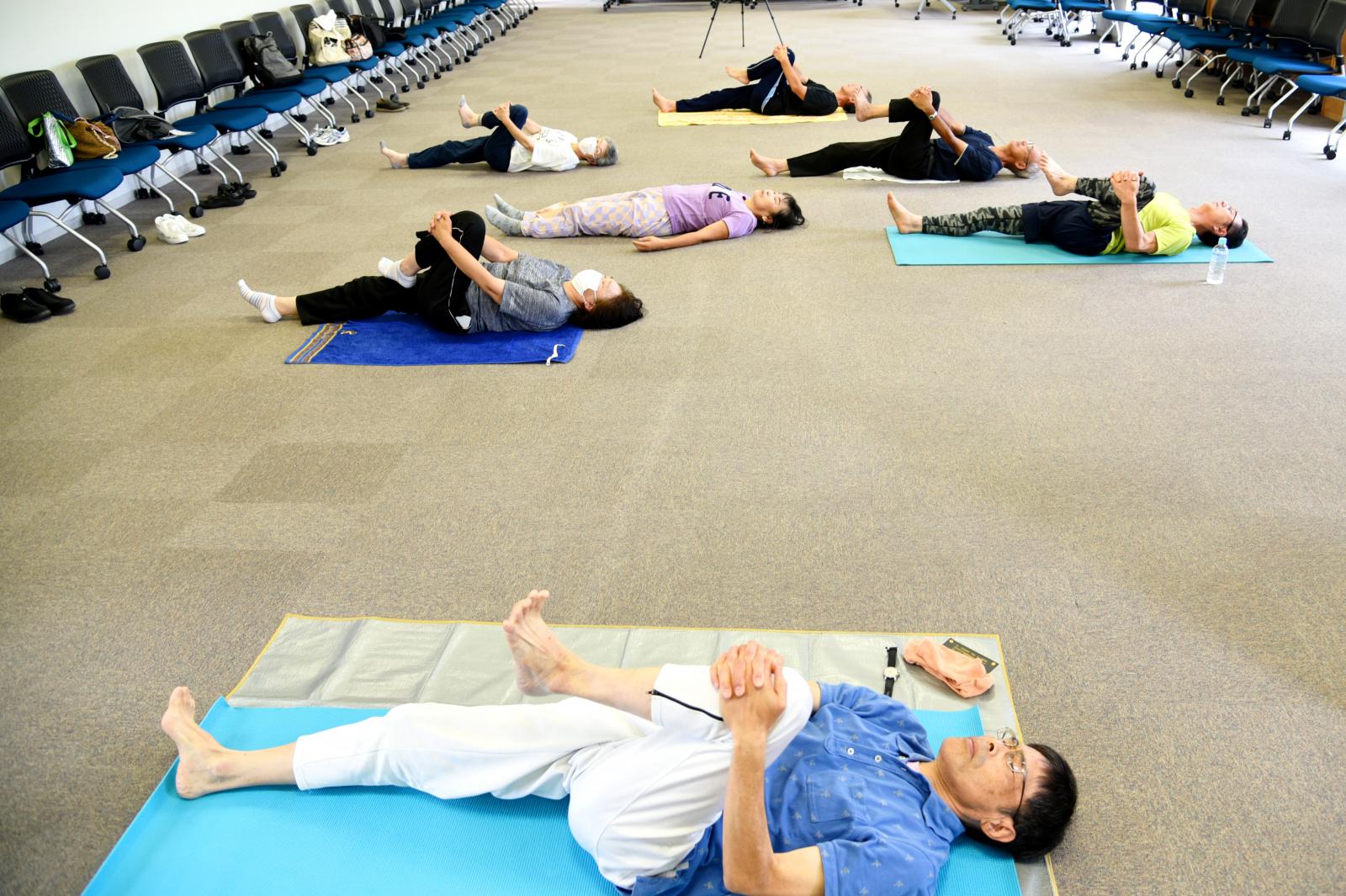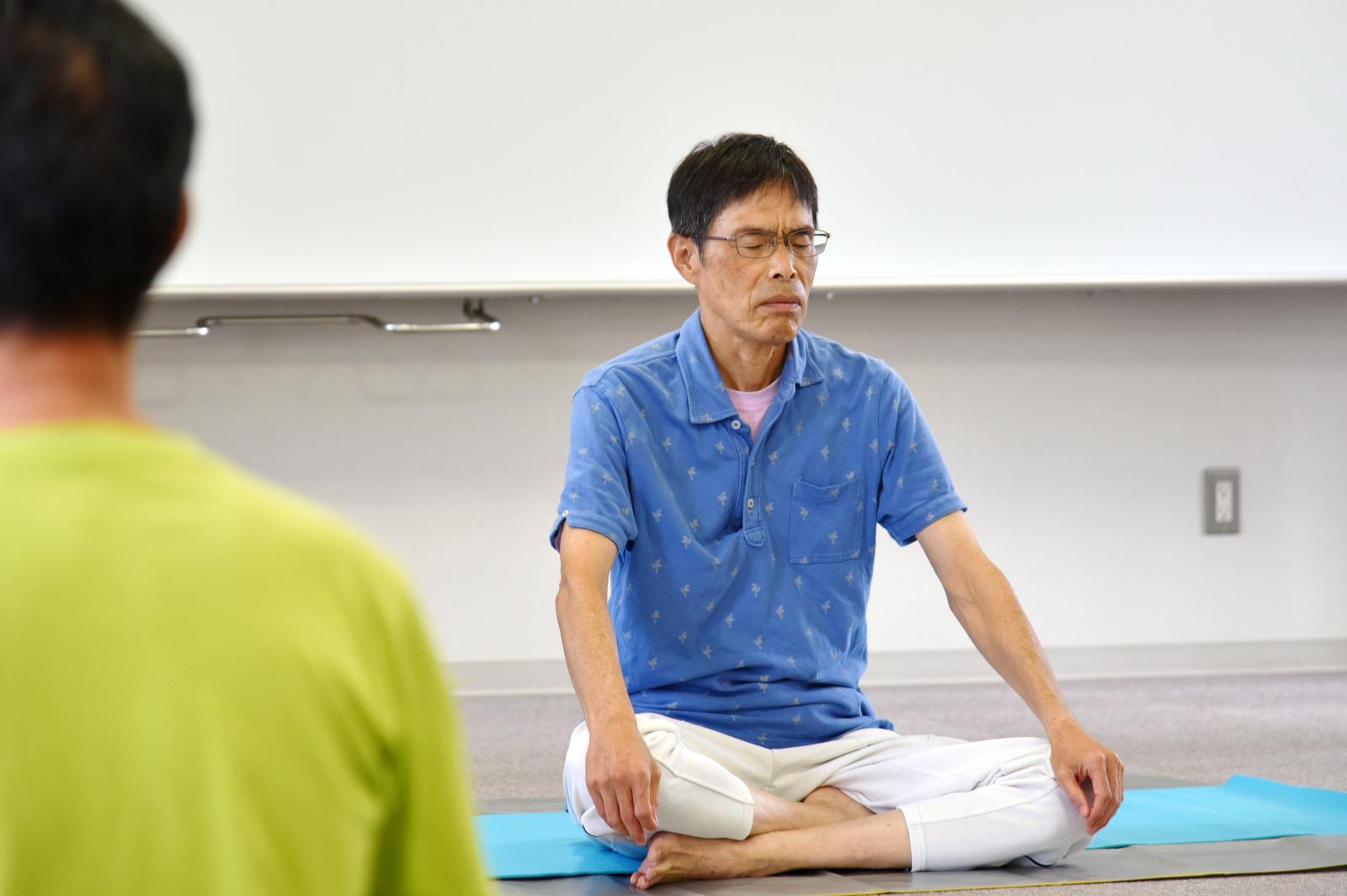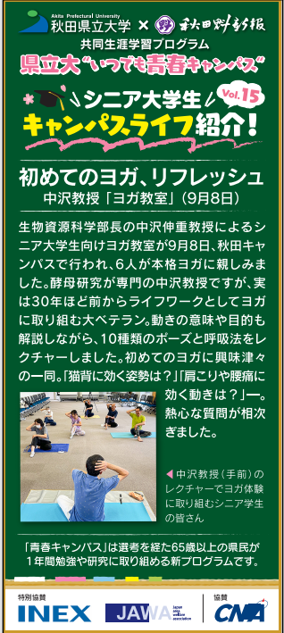 9月8日(金)、生物資源科学部応用生物科学科の中沢 伸重 教授・学部長[食品醸造グループ、専門:分子育種学]による『ヨガ教室』が秋田キャンパスで開催され、シニア大学生6名が参加し、本格ヨガに親しみました。