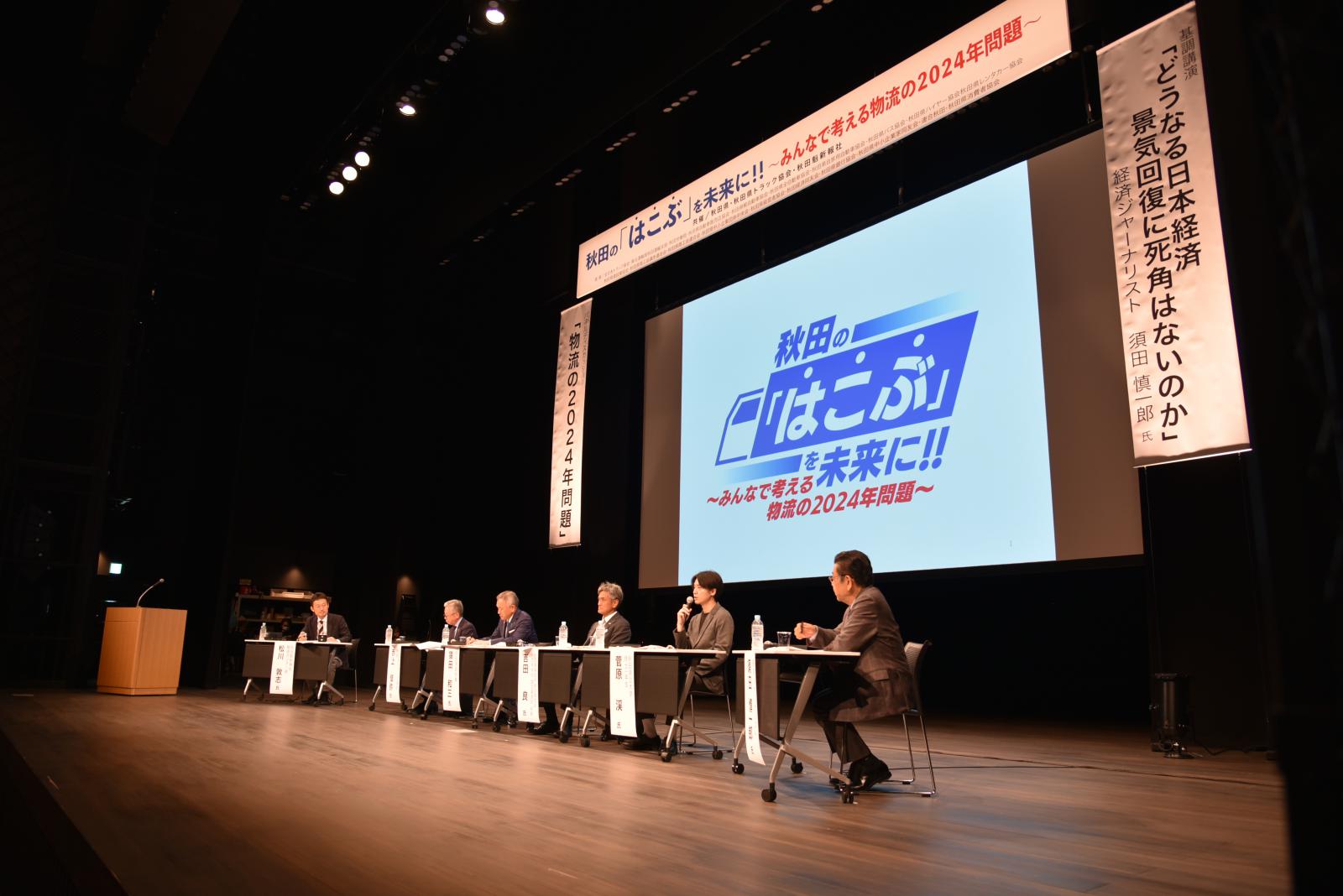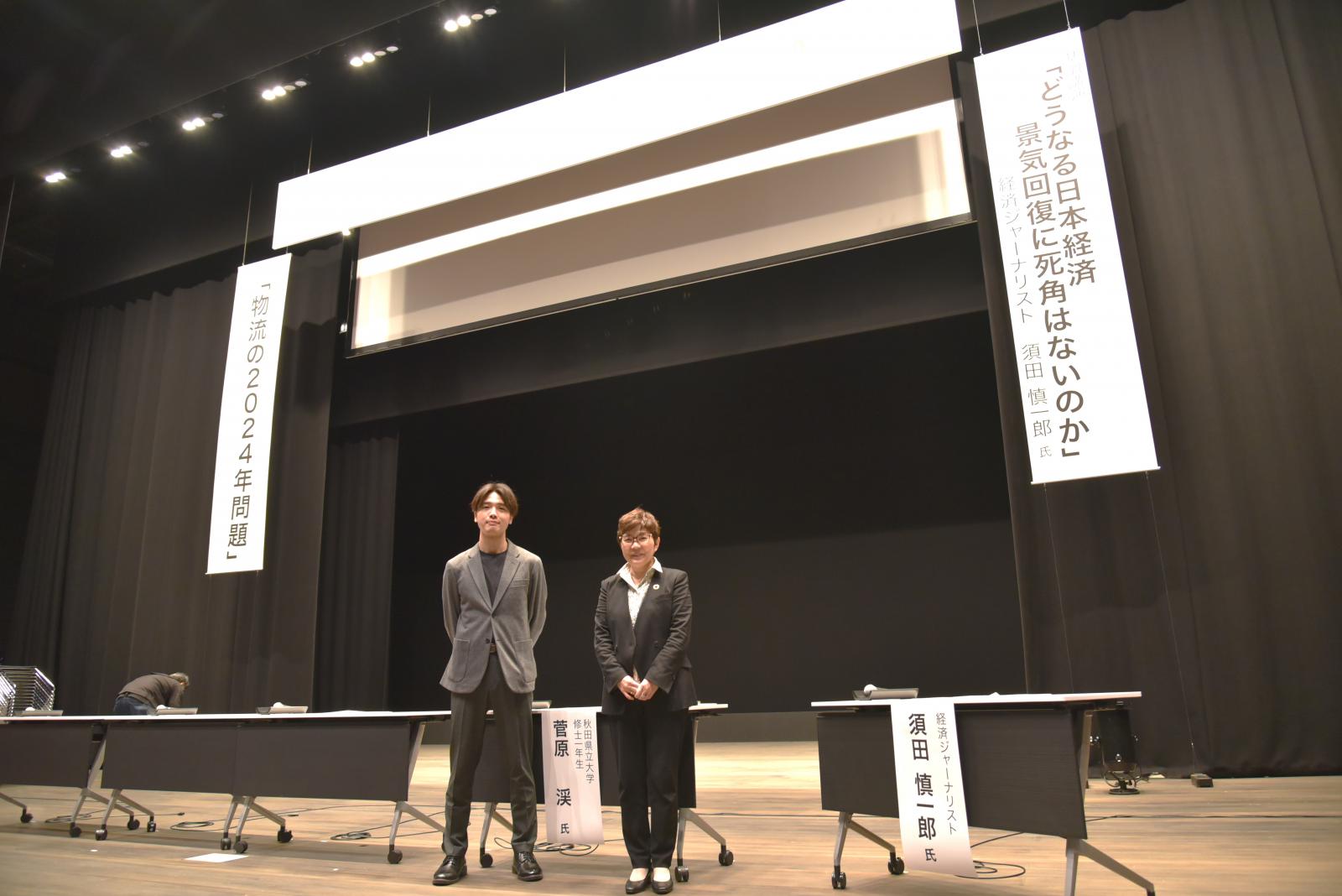 令和5年10月11日(水)、秋田市ミルハスにて秋田県、(公社)秋田県トラック協会、(株)秋田魁新報社の共催で「物流の2024年問題」について考えるシンポジウムが開催され、パネルディスカッションでは、秋田県トラック協会会長、秋田県副知事らとともに本学システム科学技術研究科 総合システム工学専攻1年の菅原渓さんがパネラーとして登壇しました。