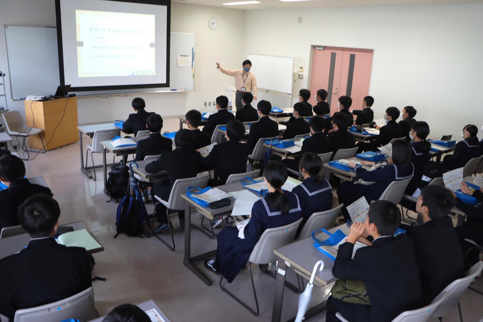「大学とは」「秋田県立大学とは」「県立大学生の生活」について、大学職員から説明を受けました。中学校、高校との違いや、大学生がどのように学んでいるか、といった大学の特徴について知りました。質疑応答