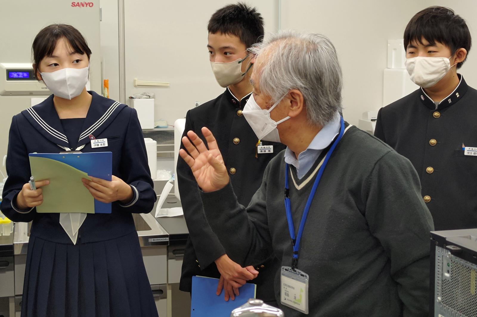 特に、バイオテクノロジーセンターでは応用生物科学科 福島淳 教授による案内で、DNA関連の最先端技術の一端に触れました。中学2年生の理科では、まだ細胞核の染色体について勉強したばかり。難しい内容でしたが、少しでも理解できるよう、真剣に説明を聞いていました。