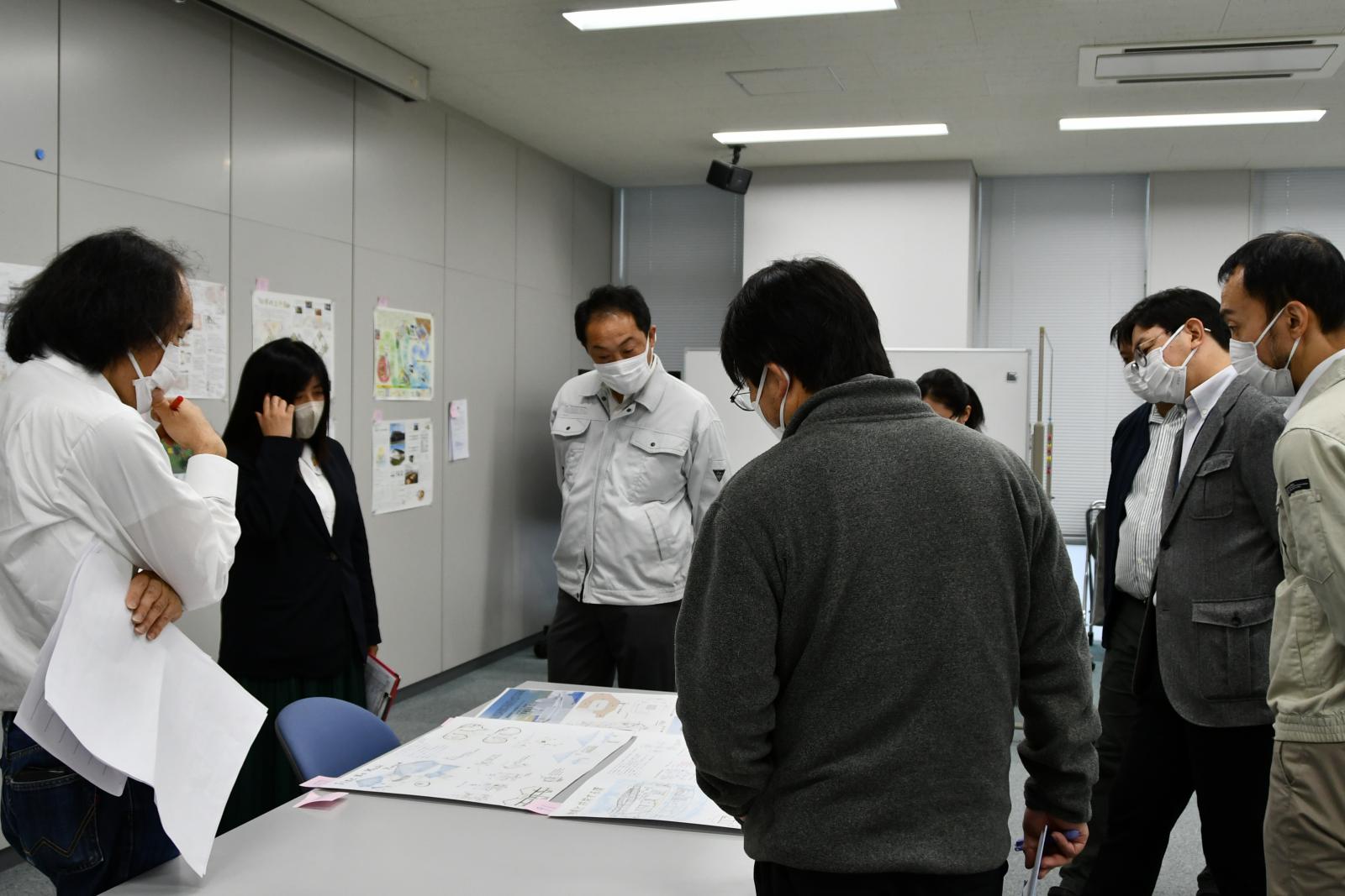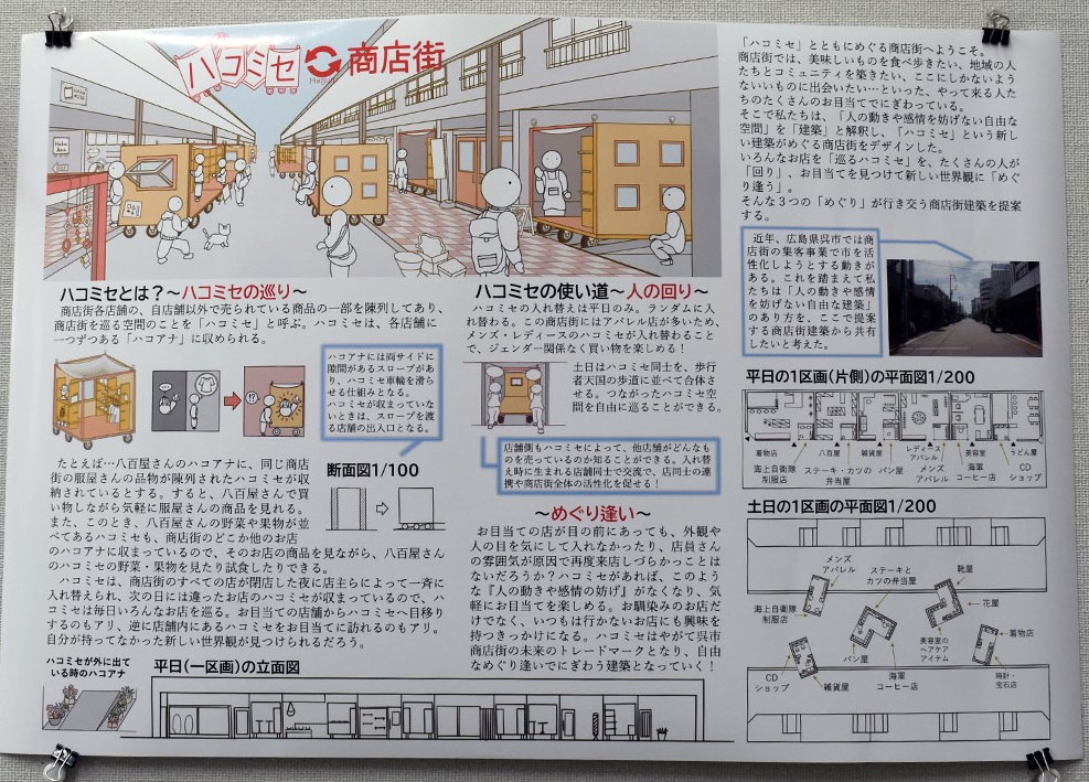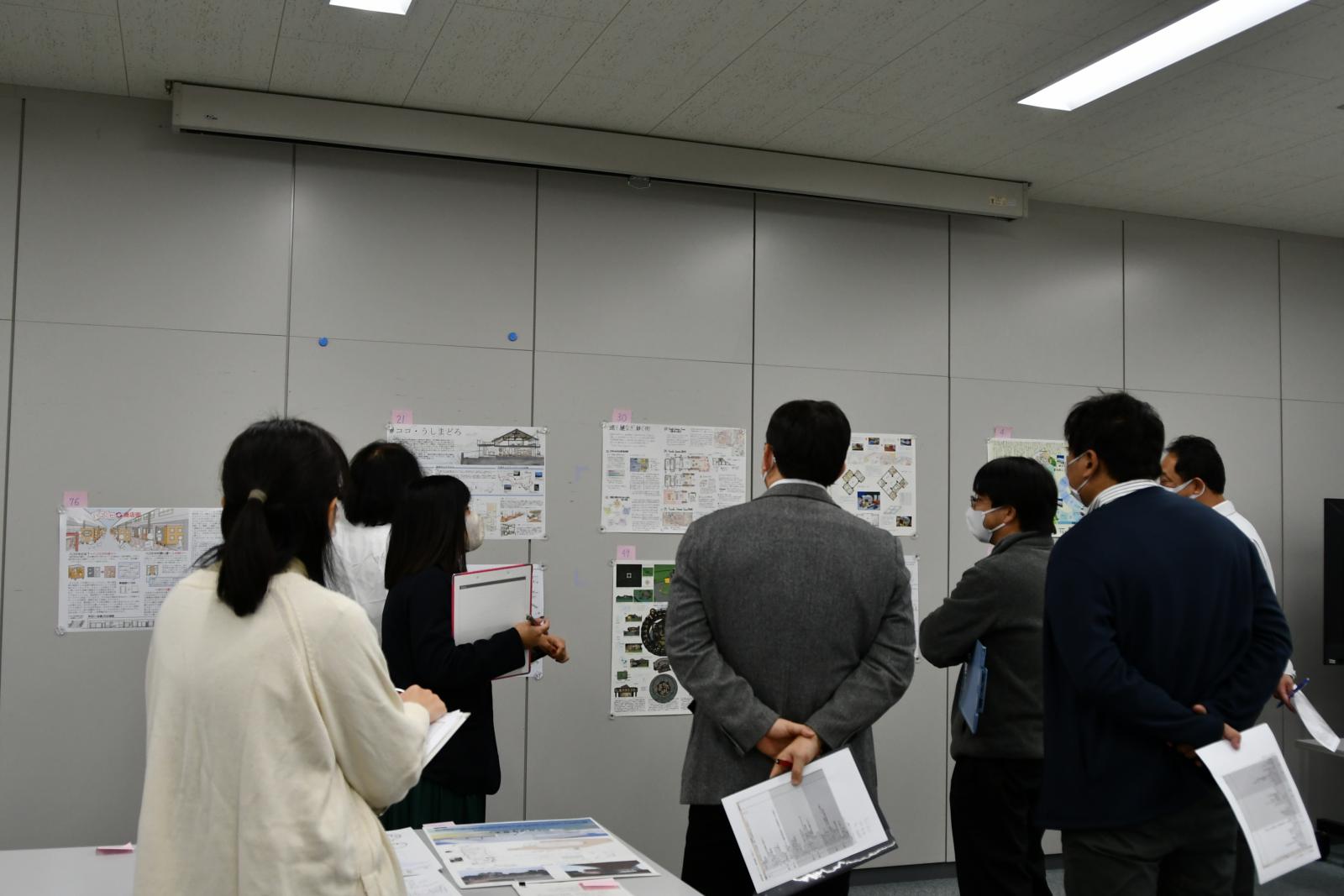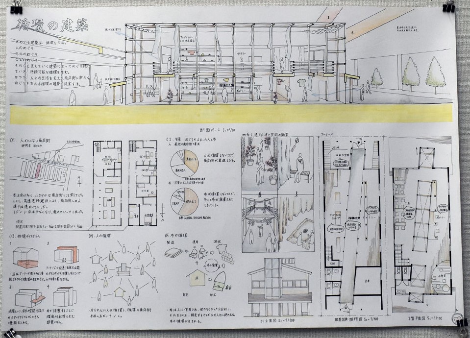 最優秀賞を受賞した「循環の建築」では、ヒト・モノ・コトがそれぞれ価値を上げながら循環することを提案しており、「めぐる」の意味を素直に表現した豊かな作品でした。優秀賞では2作品を受賞しました。「めぐる伝統、深まる学び、広がる技術 ~新しい学校教育のあり方を求めて~」は、最近活発に議論がなされているフリースクールなど多様な学校のあり方について訴求され、社会への深い洞察がなされています。また、「ハコミセ⇄商店街」では、既存の店をハコアナとし、道沿いにハコアナから出張ったお店を道沿いに提案することで商店街の活性化についてリアリティが高い提案でした。今年度の作品には、完成度が高い力作が多いとの印象を持っています。一方で、テーマの解釈に苦戦し、最後に“めぐる”を当てはめている作品も見られました。また、「めぐる」の頭に「#(ハッシュタグ)」をつけ、共有のあり方について考察してもらい、これを活用した提案にも期待していましたが、多くはありませんでした。