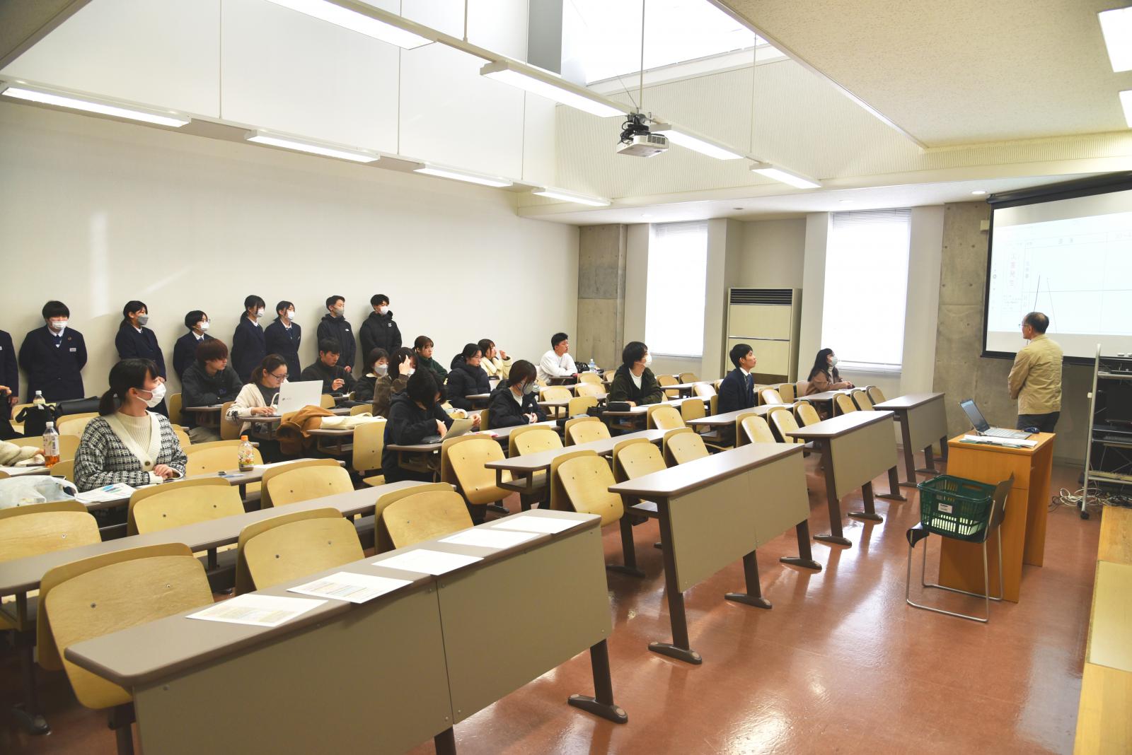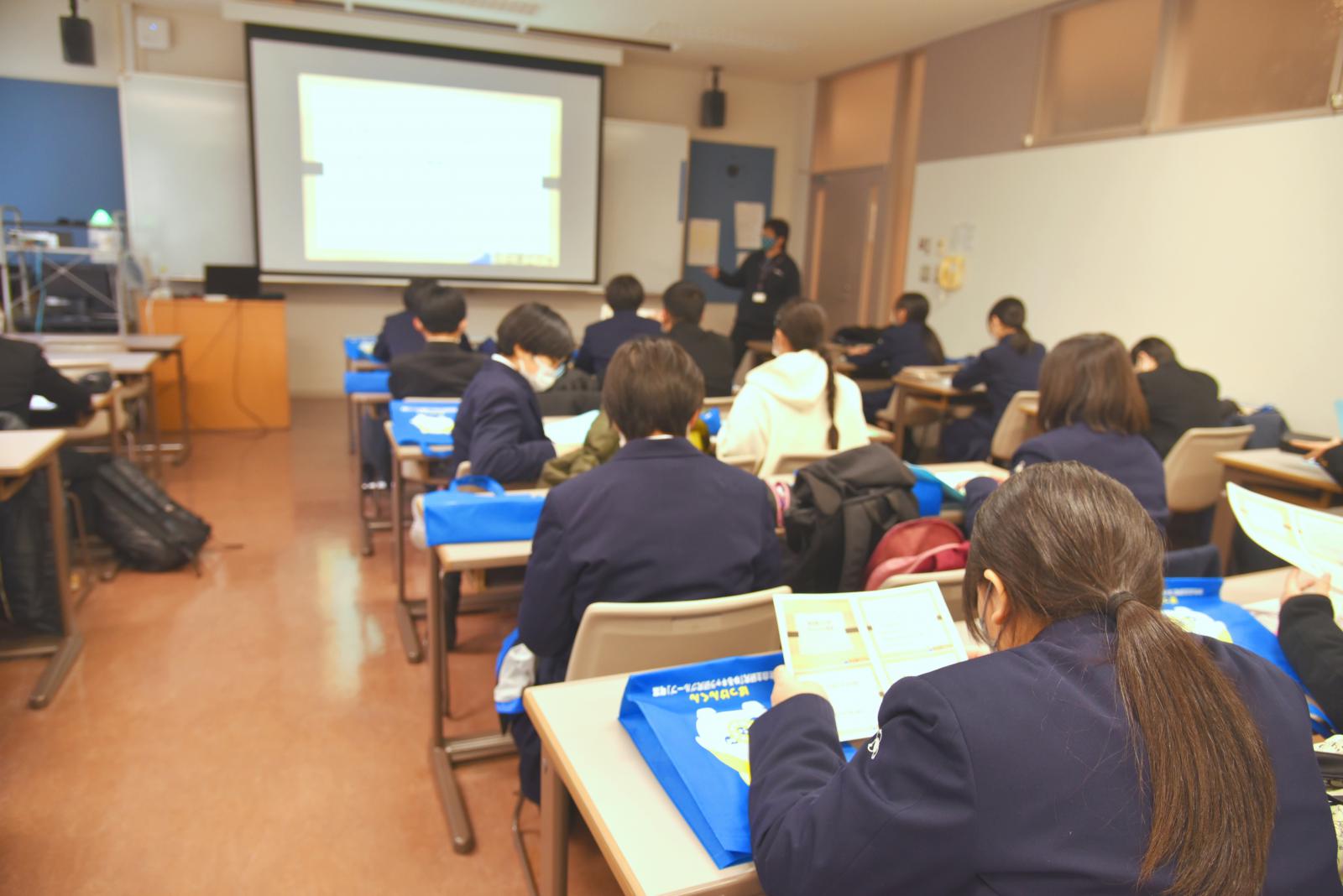 大学の説明を受けた後、実際に大学の授業を見学しました。教室では、先生を目指す学生が西 聡 教授による教職実践演習を受けており「学校における危機管理」をテーマに、生活安全や災害安全についてグループワークをしていました。
