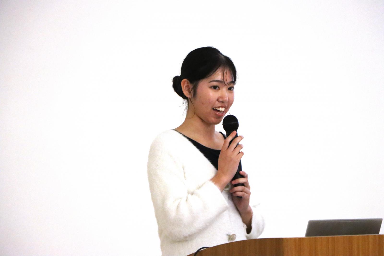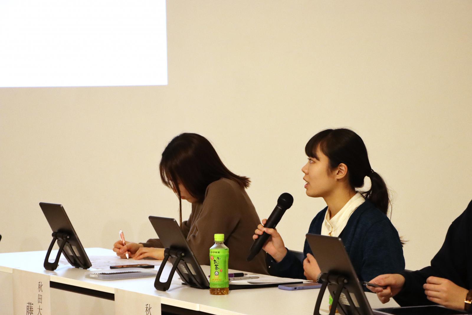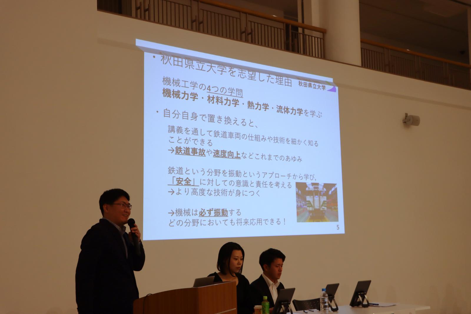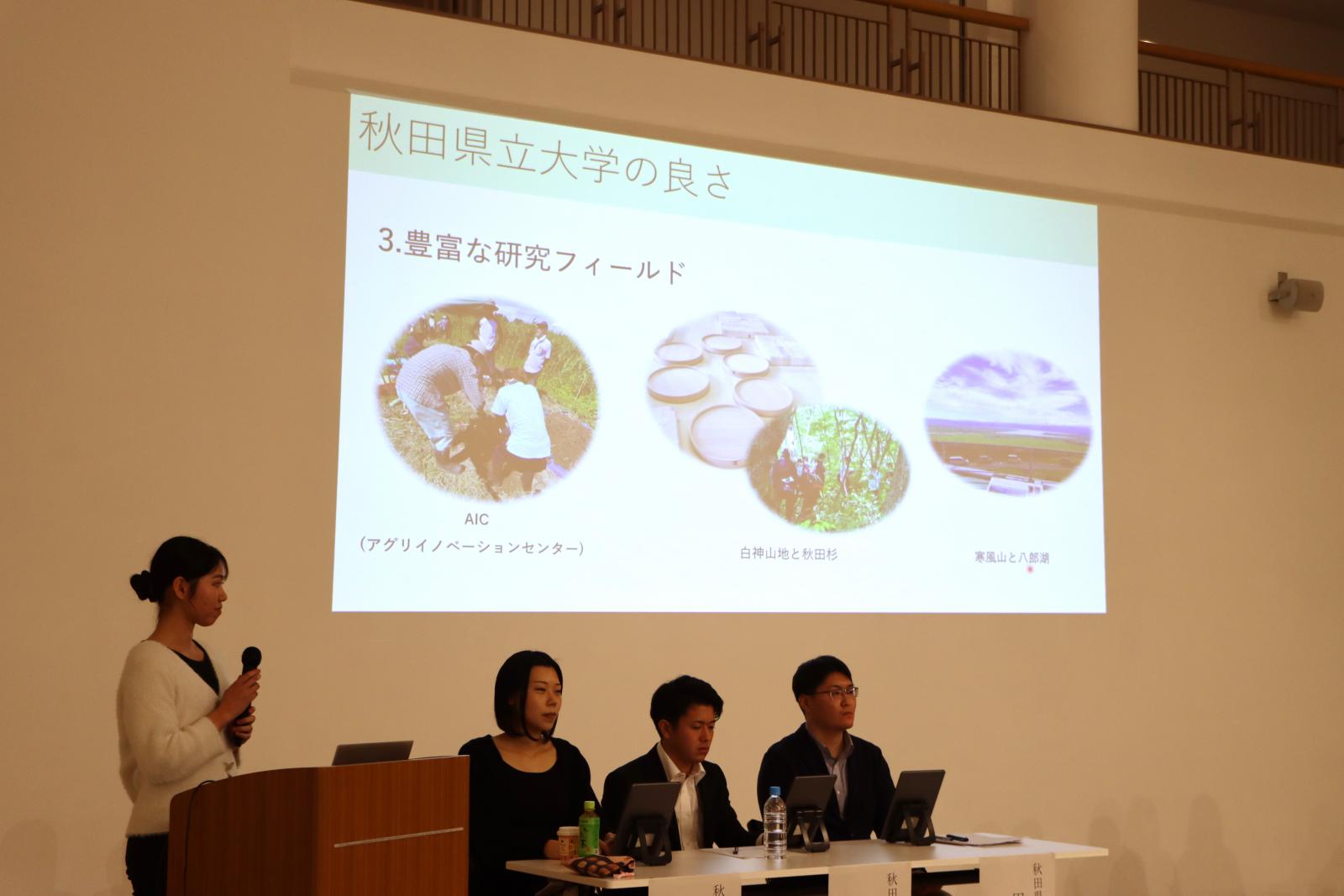本学からは、司会として生物資源科学部生物生産科学科4年 佐藤美紅さん、発表者としてシステム科学技術学部機械工学科4年 田口伊吹さん、生物資源科学部生物環境科学科3年 橋本梨香子さんが登壇しました。以前から興味のあった分野を、広く学べる大学ということで秋田県立大学を志望し、入学後はその興味の領域を広げて充実した大学生活を過ごしていることを紹介してくれました。