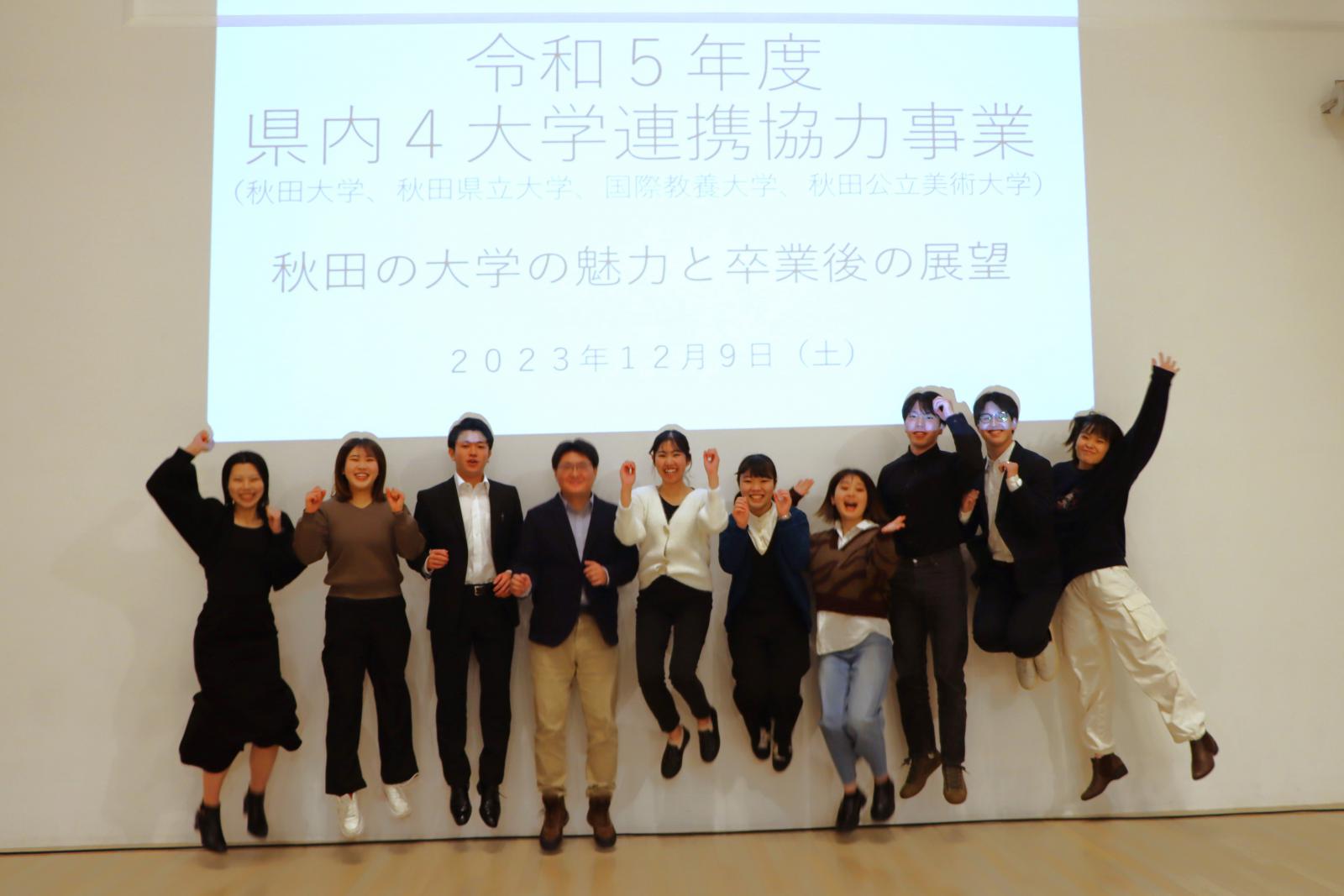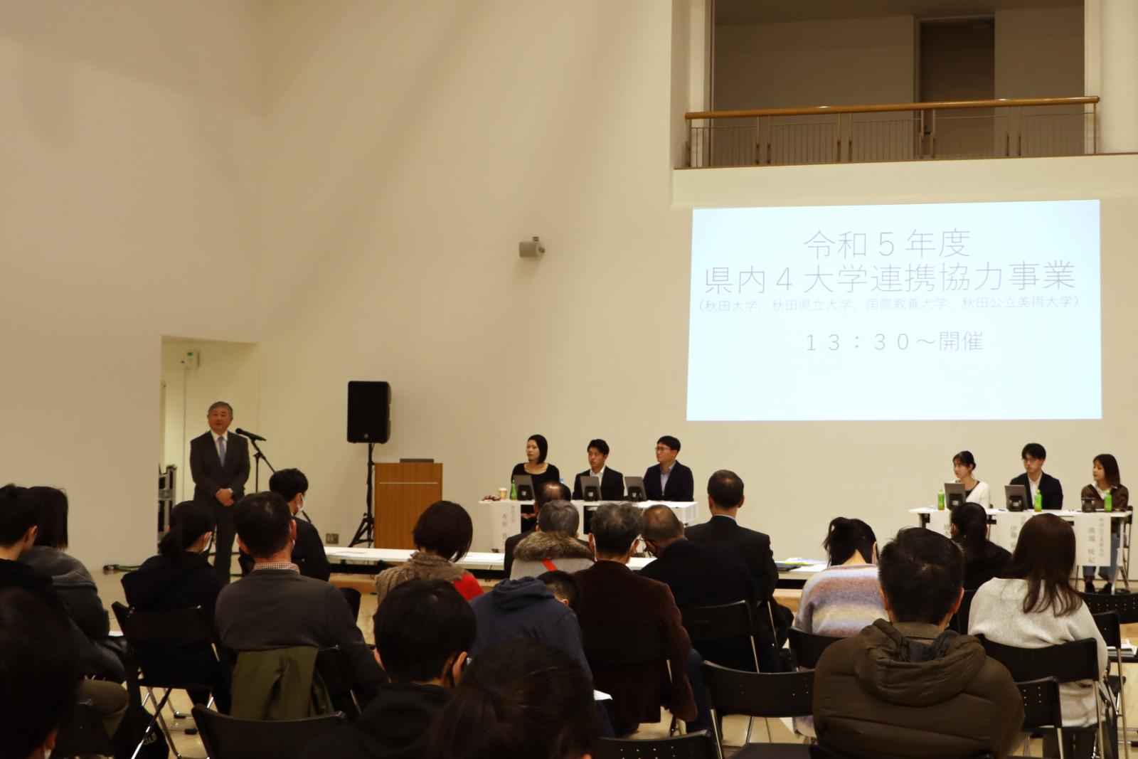 令和5年12月9日(土)、令和5年度県内4大学連携協力事業を開催しました。秋田県内国公立4大学(秋田県立大学、秋田大学、国際教養大学、秋田公立美術大学)は、 地域の発展に寄与することを目的として、毎年連携協力事業に取り組んでいます。