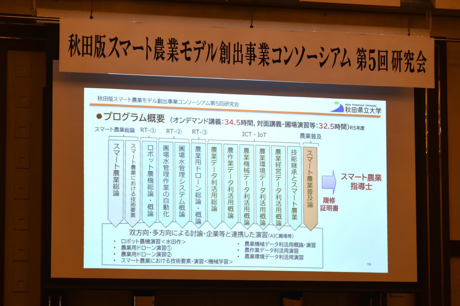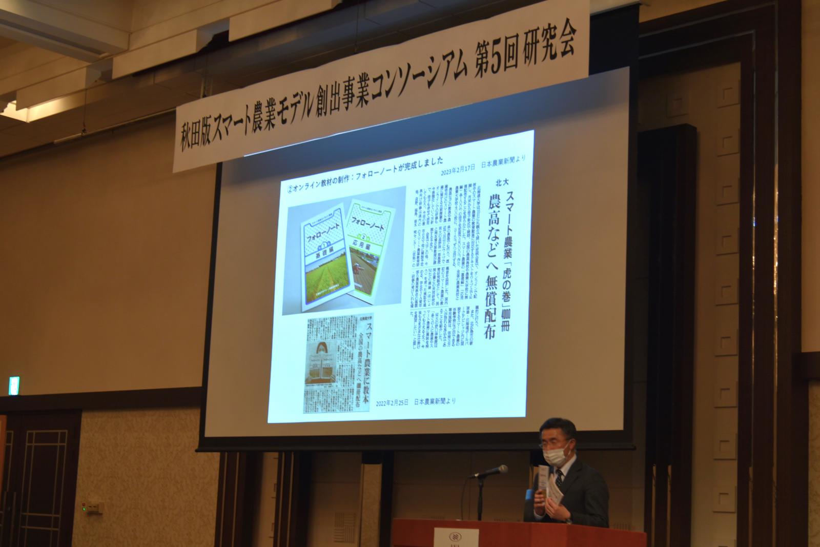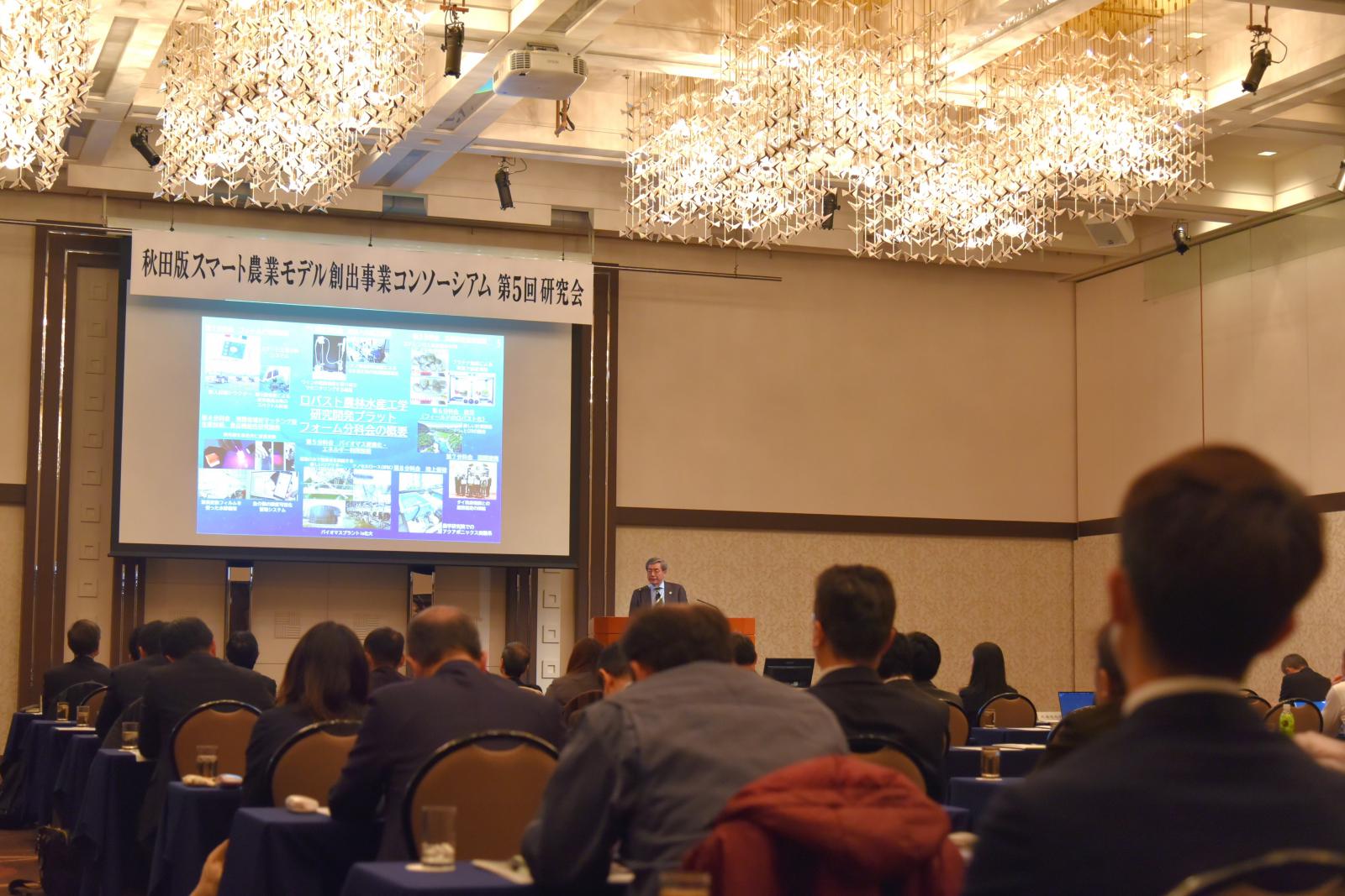 令和5年12月14日(木)秋田市のANAクラウンプラザホテルにて、「秋田版スマート農業モデル創出事業コンソーシアム 第5回研究会」を開催し、コンソーシアム会員のほか、高校の農業関係教員など75名が参加しました。