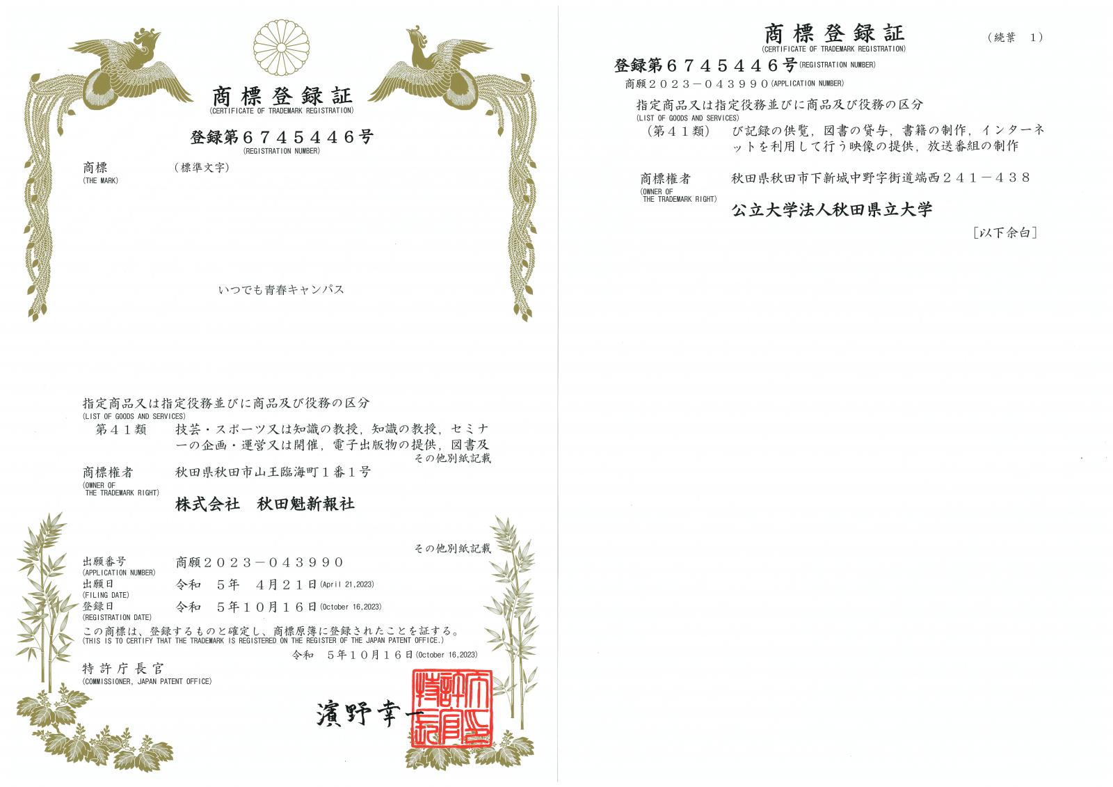 本学と秋田魁新報社が、県民の生涯学習支援と地域活性化、健康寿命の延伸を目指し連携・展開する生涯学習プログラム『いつでも青春キャンパス』を商標登録いたしました。商標出願・登録情報