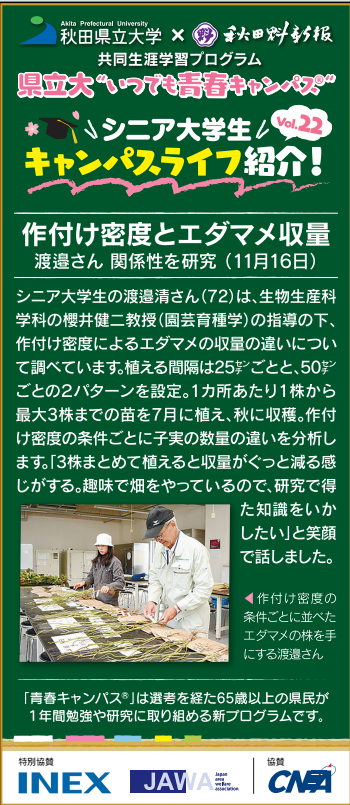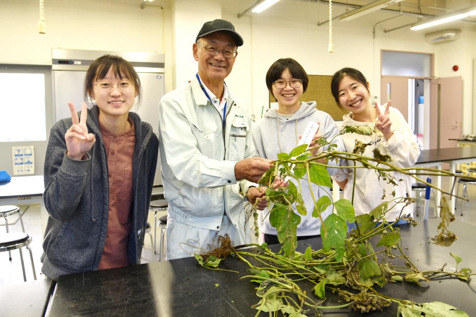 渡邉さんは、生物生産科学科の櫻井 健二 教授[専門:園芸育種学]の指導の下、エダマメを植える間隔を25cmごとと、50cmごとの2パターンで設定し、1か所あたり1株から最大3株までの苗を7月に植え、11月16日、秋田キャンパス実験圃場でエダマメを収穫しました。