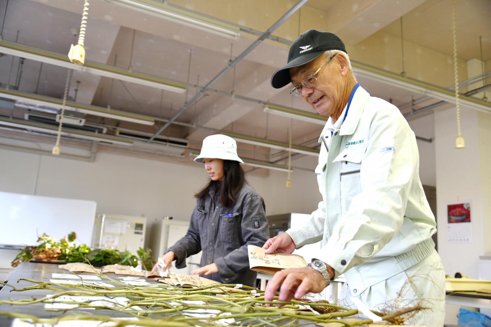 シニア大学生の渡邉 清さん(72歳)は、『エダマメの間引き効果の比較・検証』というテーマで、作付け密度によるエダマメの収量の違いを明らかにする研究に取り組んでいます。