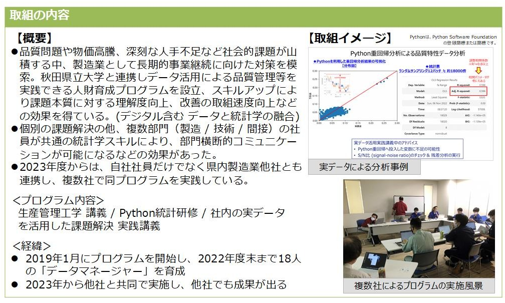 システム科学技術学部経営システム工学科の嶋崎真仁教授[専門:社会システム工学]が支援した、秋田エプソン株式会社(湯沢市)が、東北経済産業局が東北地域におけるDX(デジタルトランスフォーメーション)に挑戦する企業等の取組のうち、特に優れたものを表彰する「TOHOKU DX大賞」の優秀賞を受賞しました。本表彰の業務プロセス部門での県内企業の受賞は初めてです。嶋崎教授は、湯沢翔北高校と連携し、データ活用による品質管理等を実践できる人財育成プログラムの設立等を支援し、同社社員のスキルアップにより課題本質に対する理解度向上、改善の取組速度向上を実現しました。これまでに18名のデータマネージャーの育成、および地域の複数社で同プログラムを実施するなど人材育成や地域への波及にも貢献しています。