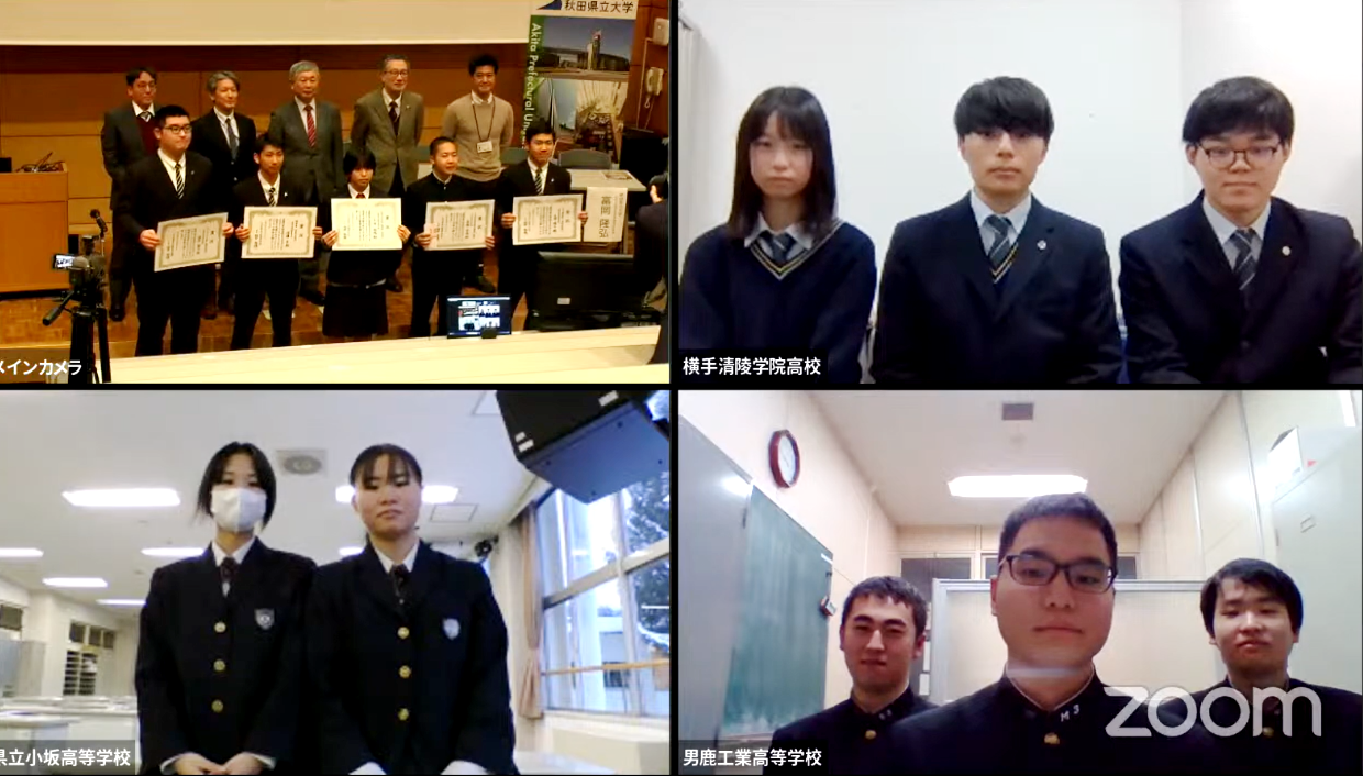 12月22日(金)、本荘キャンパスAVホールにおいて、システム科学技術学部機械工学科が主催する、「第3回高校生3Dデザイン&3Dプリントコンテスト」の表彰式が、対面及びオンラインのハイブリット方式で開催しました。本コンテストは、将来、ものづくりの分野で活躍する人材を育成することを目的に、3D-CADのスキルと発想力を競うコンテストです。3回目となる今回は、東北地域の高校生(3D-CAD経験者)、および3D-CAD体験会の参加者(中学生を含む)の2区分に対象を拡大し、『コンパクトに出来て持ち運びやすいスマホスタンド』をテーマに作品を募集したところ、難しい課題ながらも、総勢33作品の応募がありました。