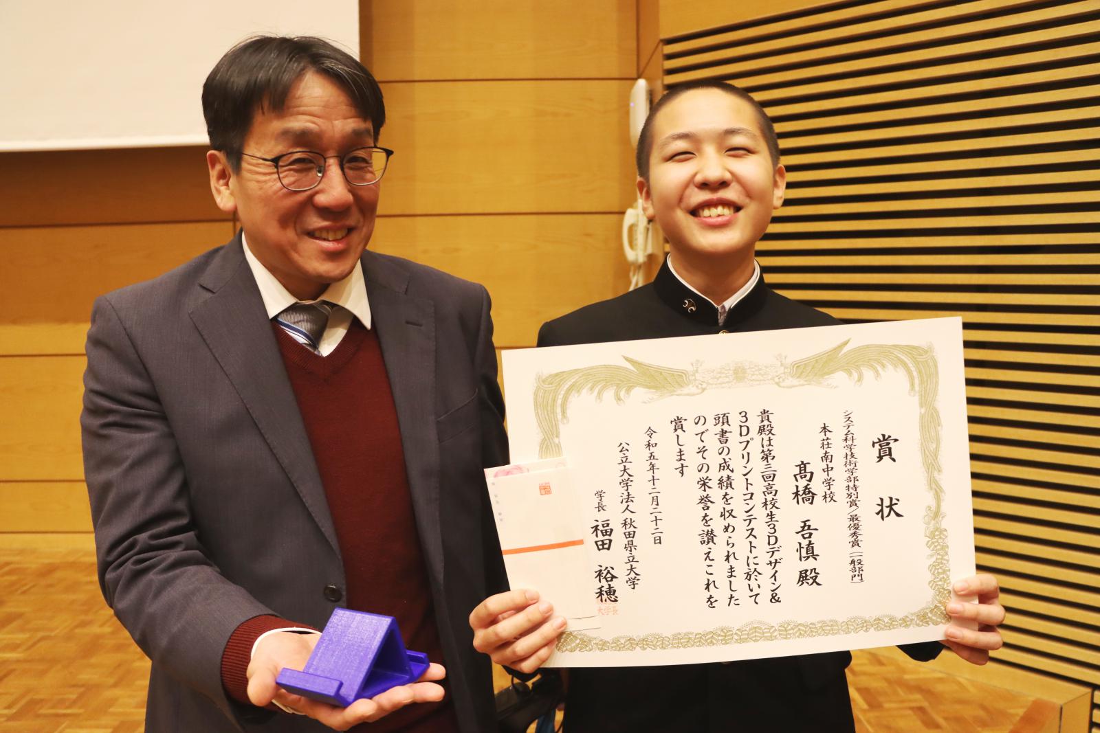 意匠性や機能性、デザインなどについて審査した結果、高校生部門(3D-CAD 経験者)では、秋田県立大学特別賞/最優秀賞1名、ベストコンパクト賞1名、ベストデザイン賞1名、ベスト機能賞1名、企業賞1名、優秀賞9名、優良賞17名、一般部門(3D-CAD 体験教室参加者)では、システム科学技術学部特別賞/一般部門最優秀賞1名が選ばれ、各受賞者には、機械工学科の富岡 隆弘学科長から表彰状と副賞が授与されました。【※受賞者は後掲のとおり。】