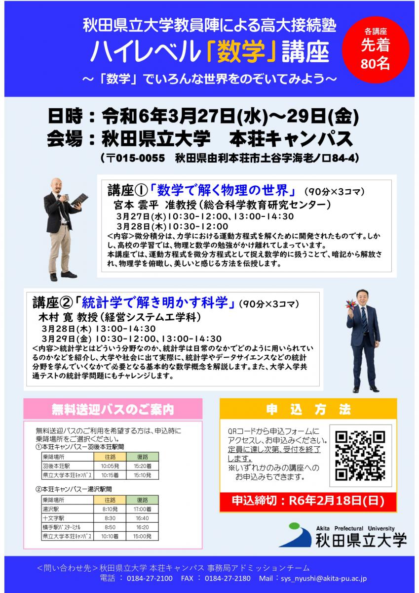 令和6年3月27日(水)~29日(金)の3日間、本荘キャンパスでハイレベル数学講座を開催します。この講座は、理数科目に関心の高い県内高校生に対し、社会への活用を見据えた数学や統計学の学習をし、また、数学と物理がどう結びつくかを学ぶことで高校数学の深い理解を目指します。各講座を修了した方には修了証を交付します。