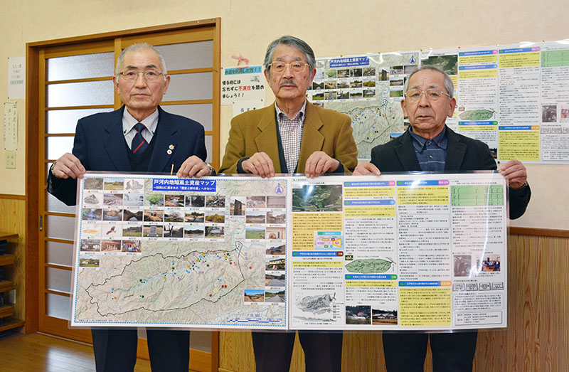 戸河内地域風土資産マップを手にする永山さん(中)
