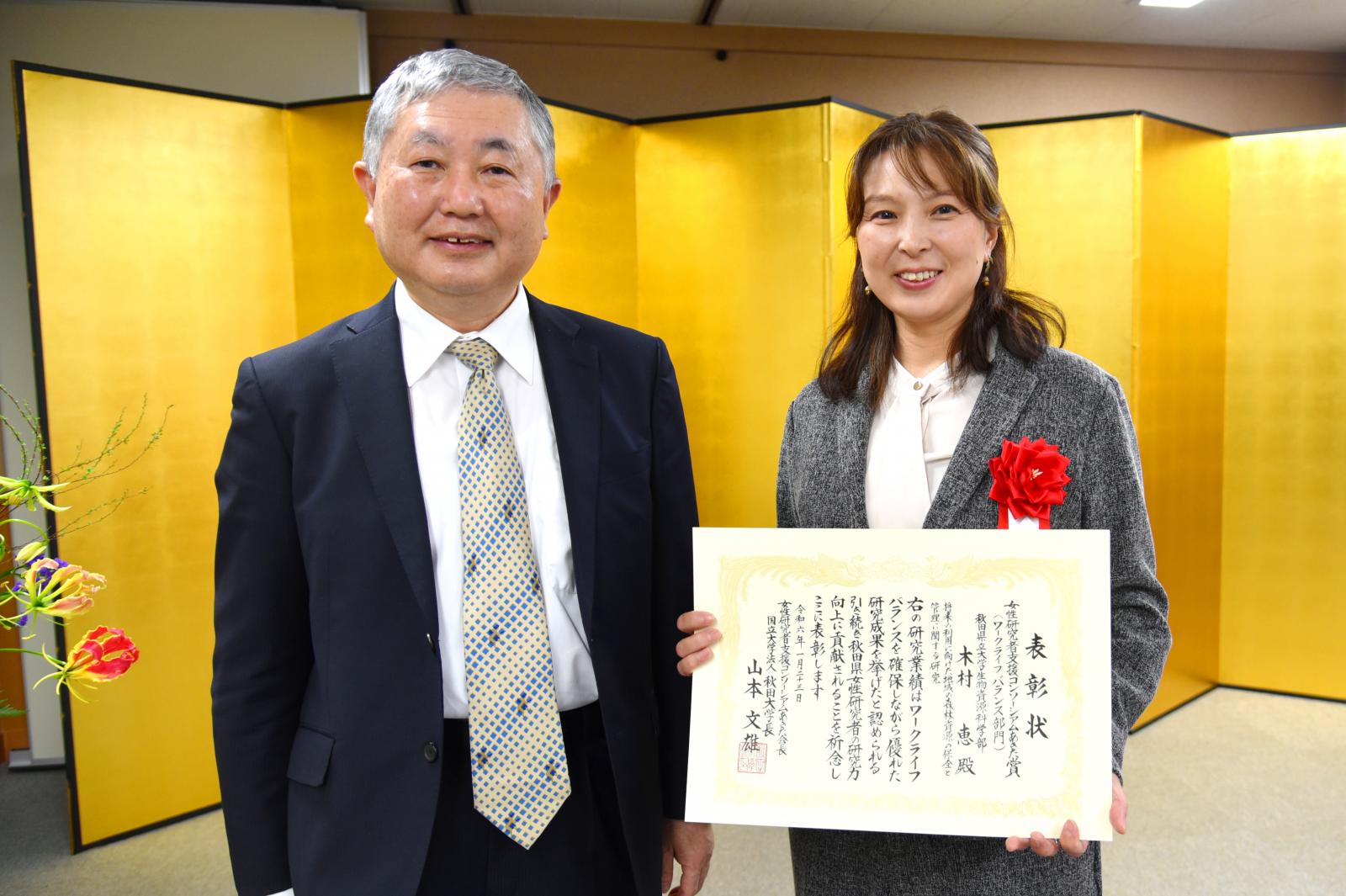 この度、生物資源科学部生物環境科学科の木村 恵 准教授(森林科学研究室 専門:森林生態学)が、「女性研究者支援コンソーシアムあきた賞(ワークライフバランス部門)」を受賞し、令和6年1月23日(月)、秋田大学で表彰式および受賞記念講演が開催されました。本賞は、女性研究者支援コンソーシアムを構成する各機関の女性研究者の優れた成果・取組を顕彰することを目的に平成26年度に創設された賞で、今年度については、ワークライフバランス部門で受賞した木村准教授のほか、若手研究者学術研究部門1名、若手研究者地域貢献部門1名、合計3名の女性研究者が表彰されました。