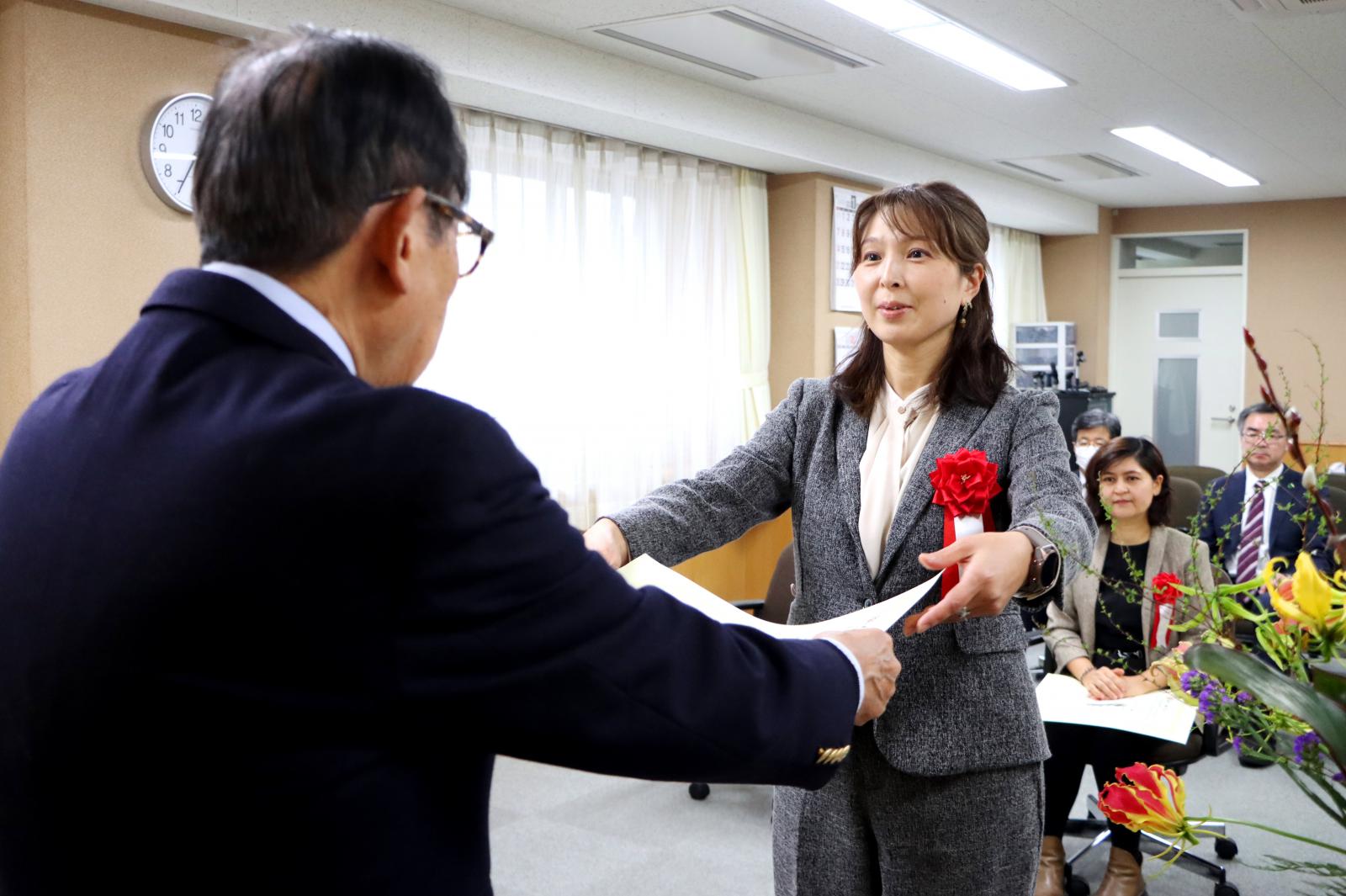 表彰式では、本コンソーシアム会長の山本文雄秋田大学長から、「この表彰が『女性研究者支援コンソーシアムあきた』参画機関に所属する女性研究者の研究意欲向上と今後の男女共同参画推進に資することを期待する」と挨拶があり、被表彰者一人ひとりに表彰状と副賞が授与され、引き続き受賞記念講演が行われました。