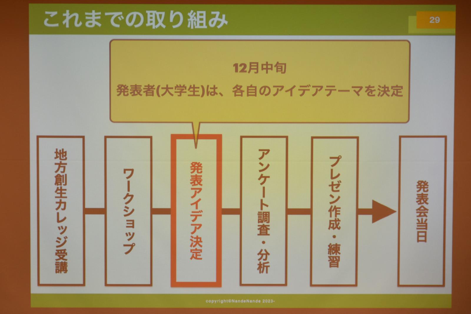「ジブンゴトの熟成期間」で、それぞれが考える地方創生テーマを決定し、高校生から社会人を対象としたアンケート調査を実施、地域の方々の声を取り入れながら分析を重ね、具体化してきたアイデアを発表しています。