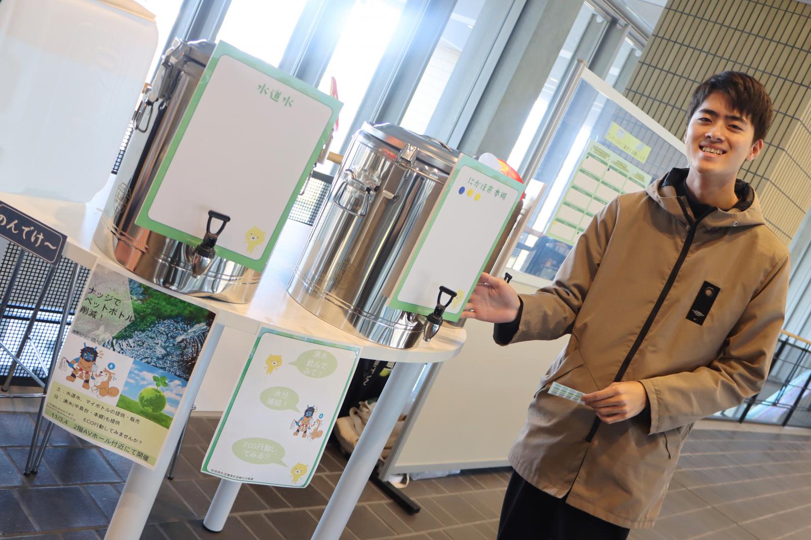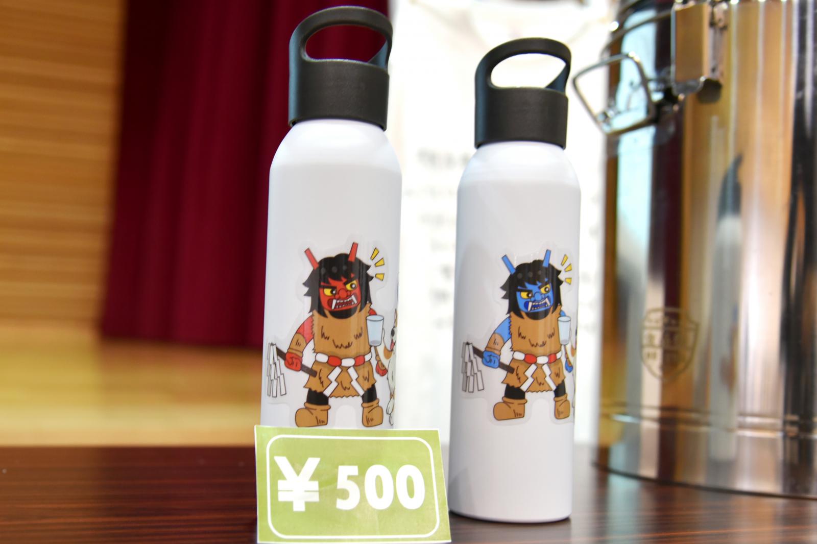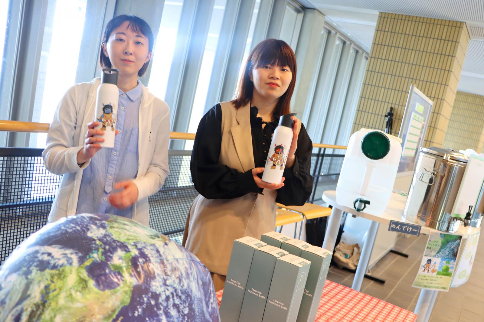 千葉さんら研究室のメンバーは、鳥海山麓から湧水を汲み、本荘キャンパス学園祭「潮風祭」や由利本荘市科学フェスティバル等の機会を捉え、湧水の飲み比べを実施しました。その際、ペットボトルを購入する代わりに、同研究室が制作・デザインしたオリジナルマイボトルを販売し、市民にマイボトル持参を呼びかけました。