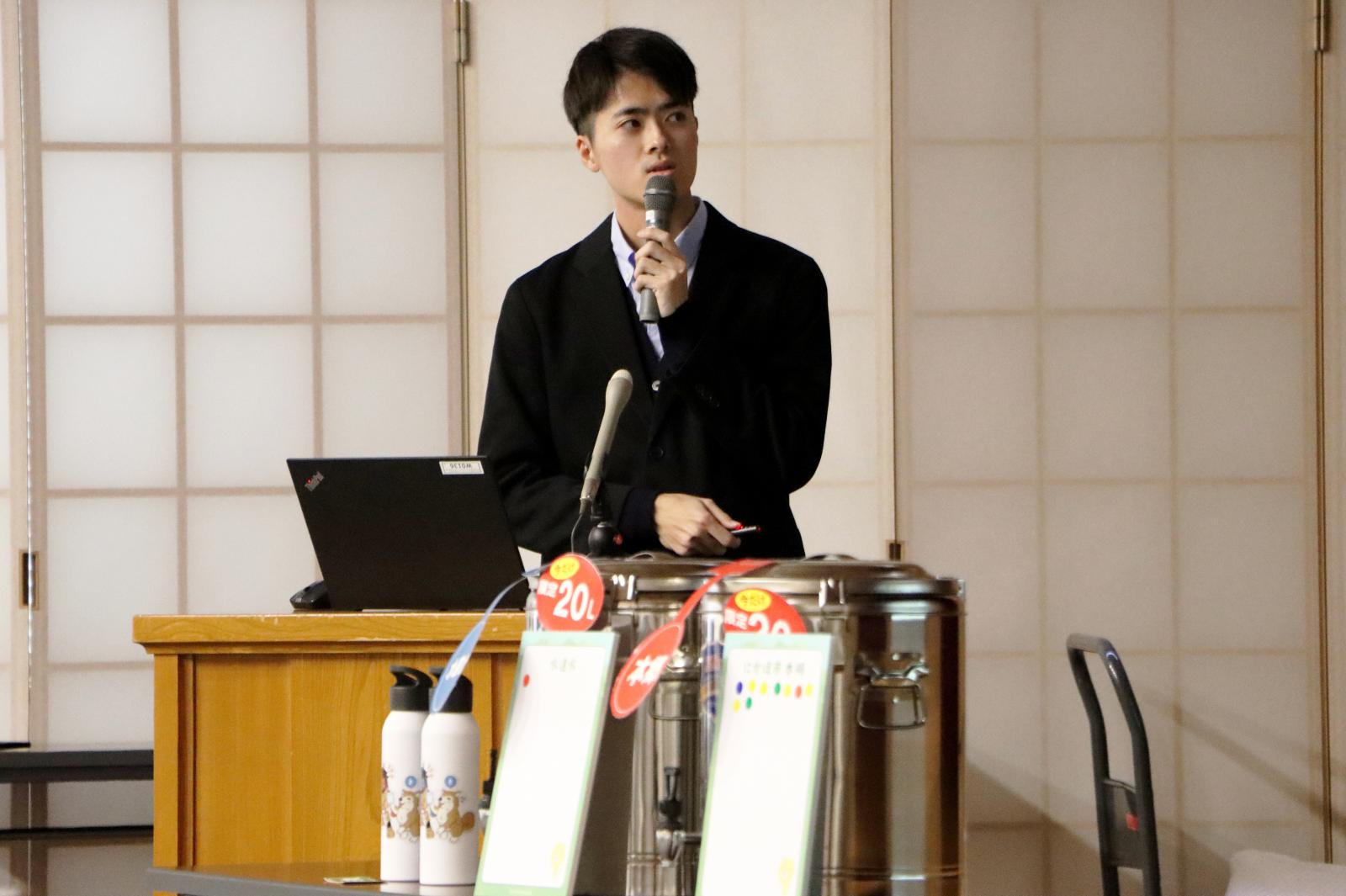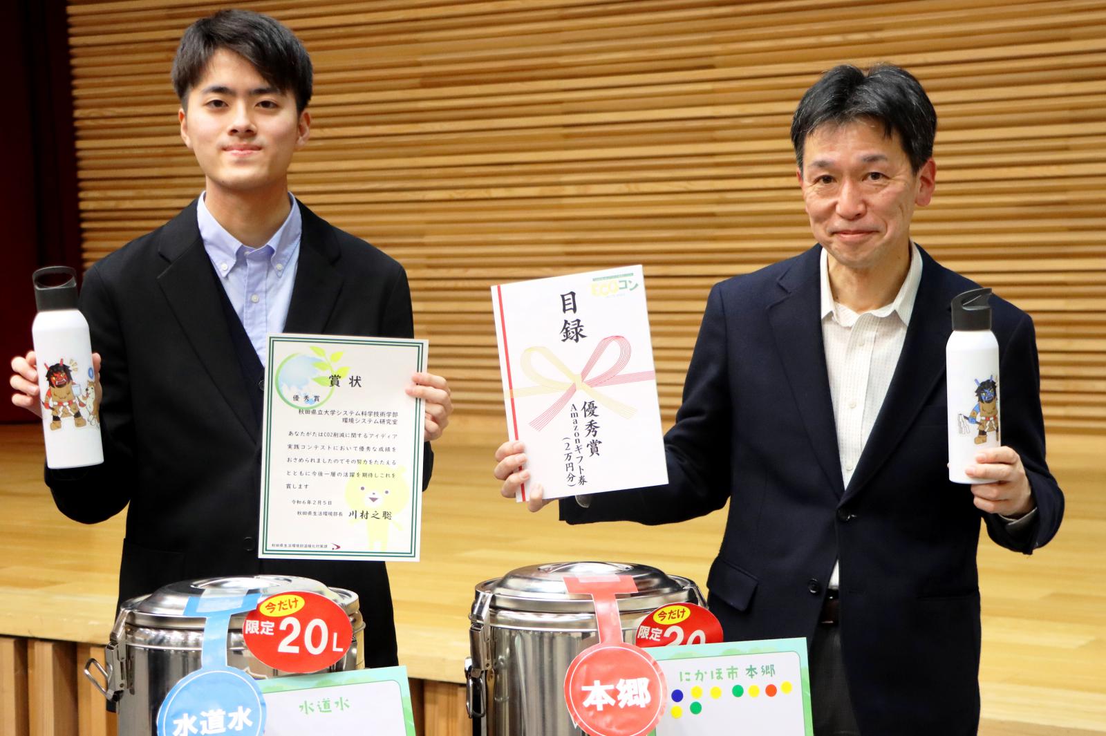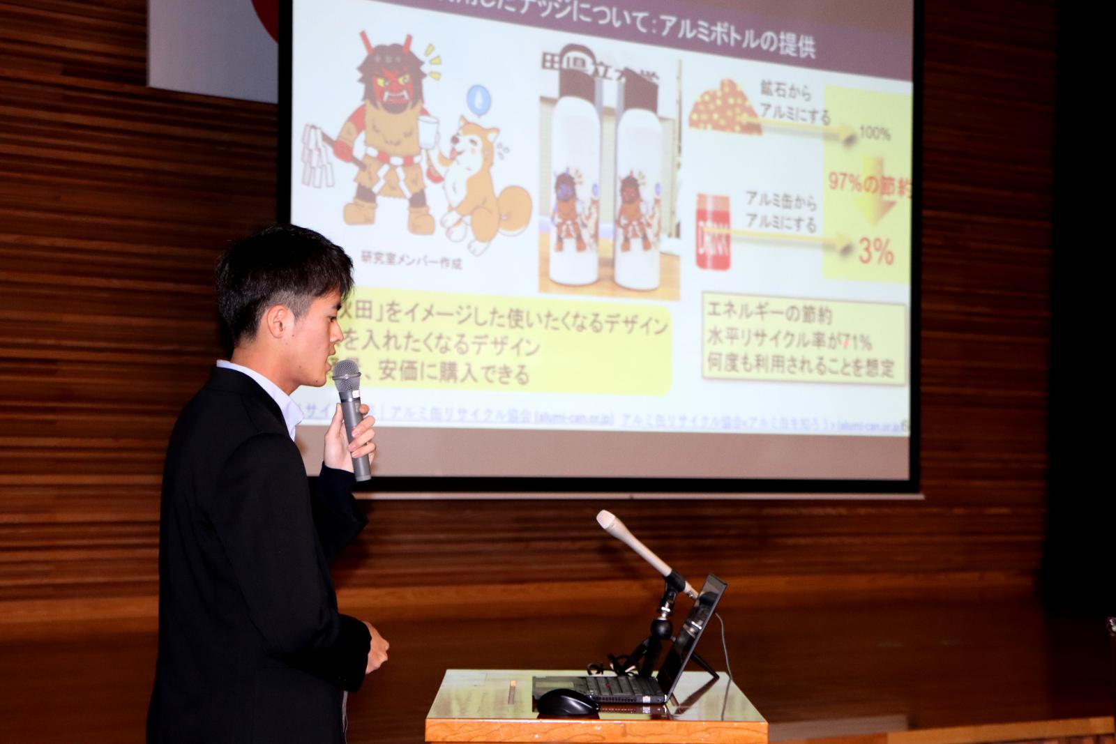 ナッジというものを初めて今回の取組で知り、CO₂の削減にどう活かしていくのか、アイデアを考えるのが一番大変でした。また、実践していくにあたって、秋田県庁の滝澤様を筆頭に、ECOコン事務局の方々の手厚いサポートがあったおかげで、滞りなく進めていくことが出来たので、楽しく取り組むことが出来ました。今後は大学院に進学するので、ナッジを用いた研究に取り組みたいと思います。また、発表時にボトルが気に入ってくださった方がいらっしゃいましたので、大学の売店などでも販売できたら嬉しいなと考えております。受賞した千葉駿さんと金澤伸浩准教授