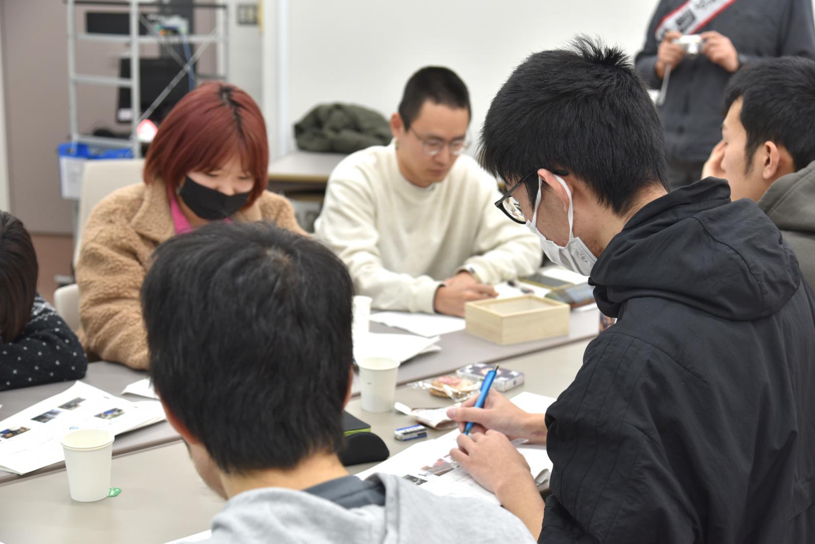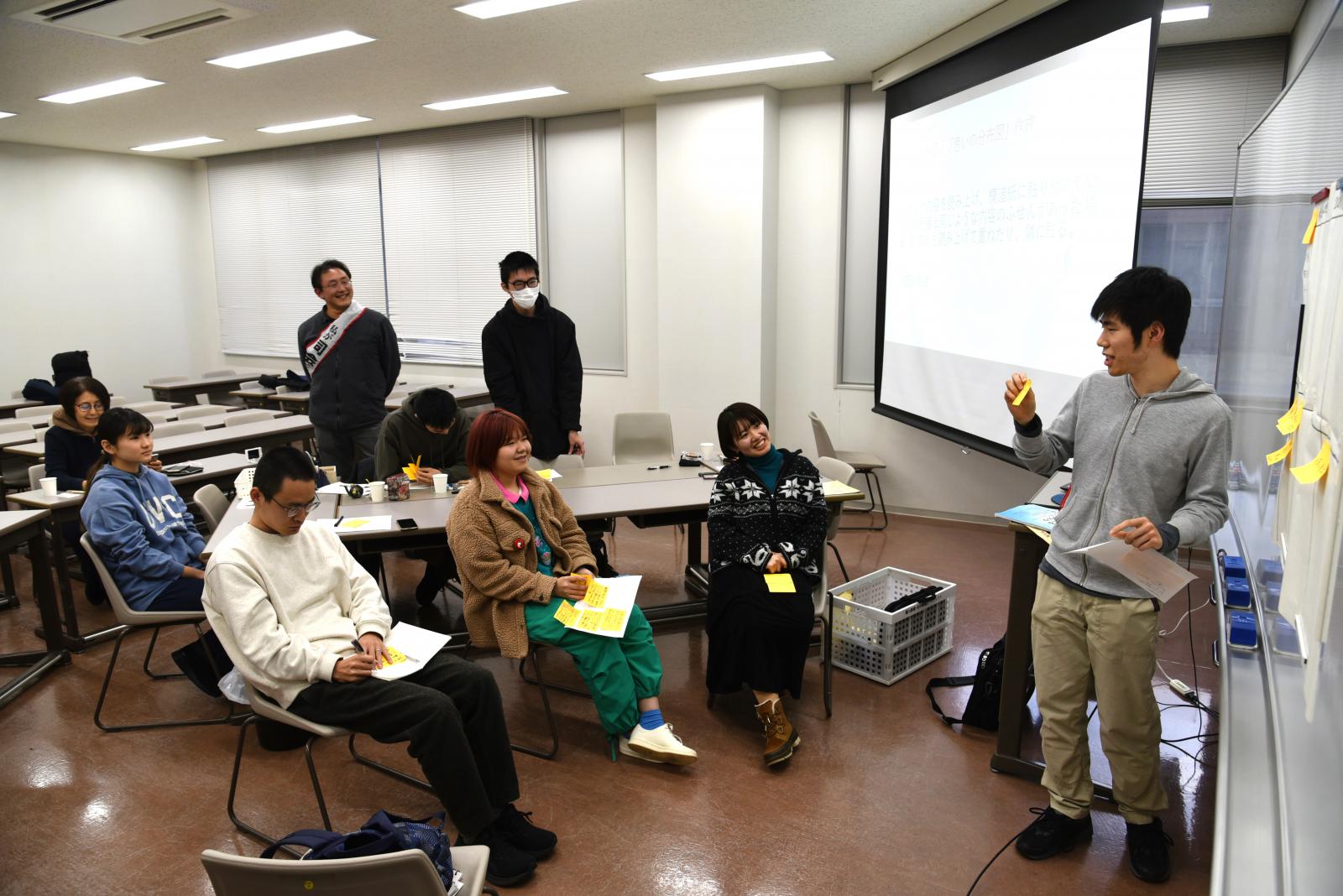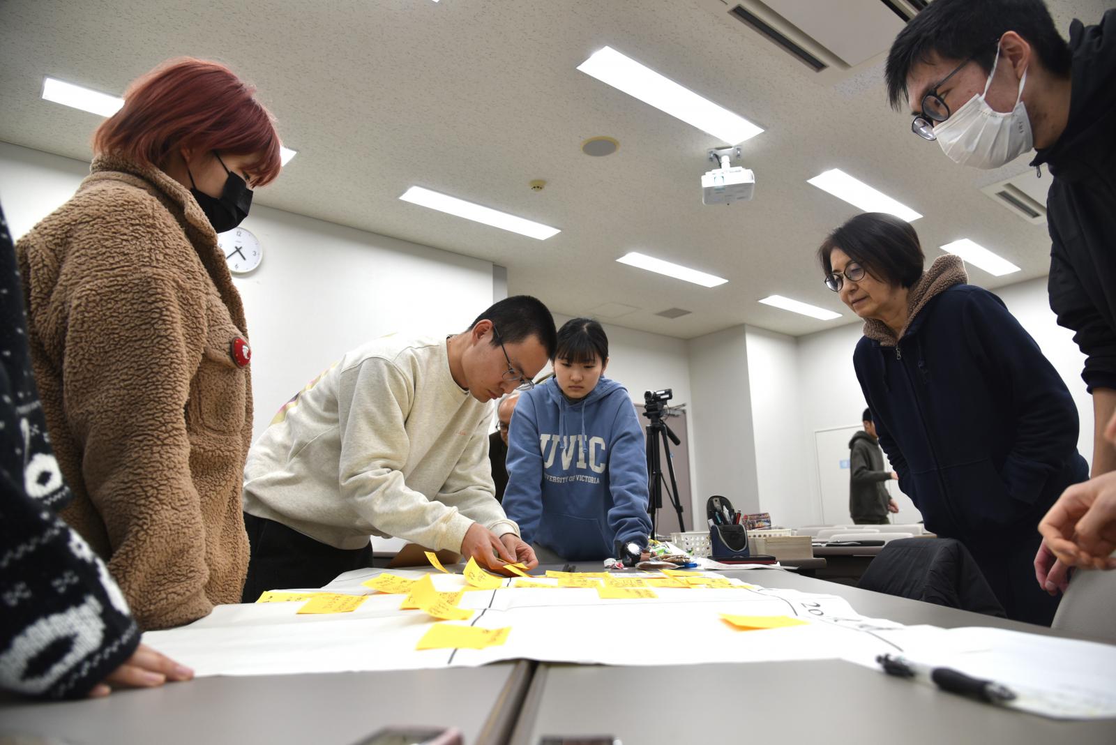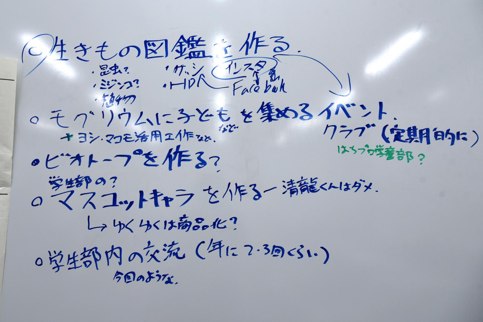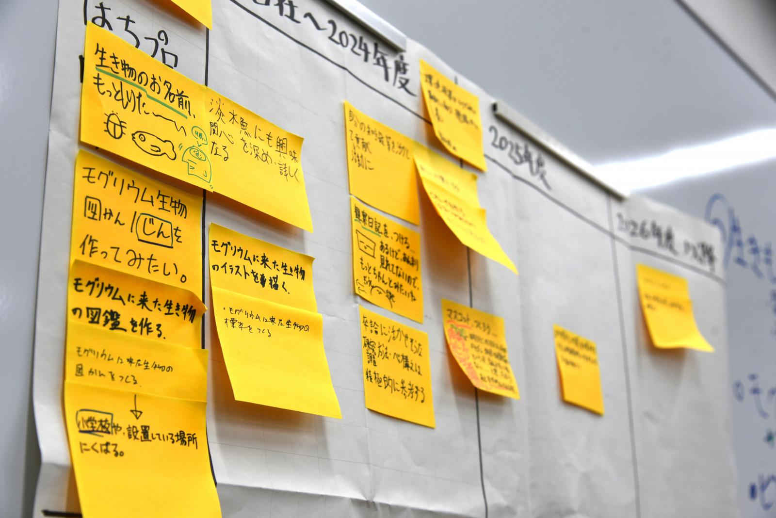 当日は、本学学生4名、秋田公立美術大学学生3名が参加し、令和5年度の活動を振り返りながら、来年度へ向けた計画を立てました。異なる学問分野、そして興味・関心の異なる学生たちが、それぞれの視点から考える“やってみたいこと”を付箋に書き出し、「生き物図鑑を作る」「モグリウムに子供を集めるイベントを開催する」などを次年度の目標として掲げることに決定しました。