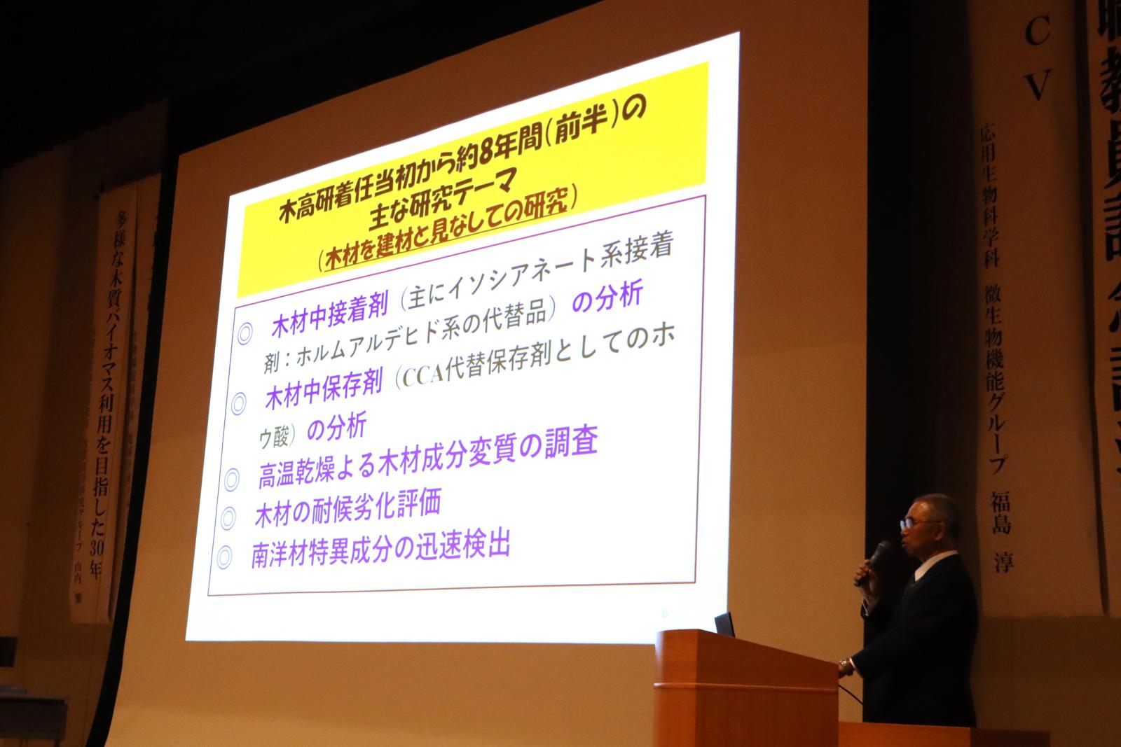 ご自身の学生時代は、「実は地球化学の研究者になりたかったが、思いがけないことから化学専攻となった。」と語られました。大学卒業後は、防衛大学校化学教室助手を経て、1999年に設置された秋田県林務部木材産業課主査(木材高度加工研究所準備室)へ着任。現在の木材高度加工研究所(木高研)の研究者としてご活躍されてきました。木高研では、分析化学の木材材料への応用や、エネルギー及び炭素資源としての木材研究に専念され、これまで数多くの論文を執筆されています。出身地である能代市を中心に、地域事業にも関わりを持ち、地域貢献にもご尽力されてきました。