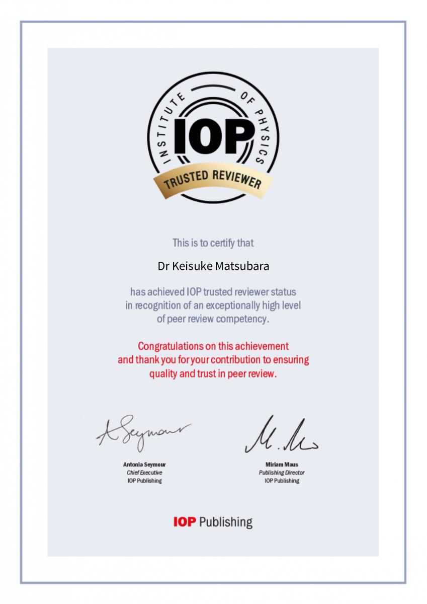 “IOP Trusted Reviewer”はIOPの学術雑誌に投稿された原稿の査読(論文の審査)において、優れた査読を複数年に渡って継続して行った研究者に与えられる称号です。松原准教授は主に医学物理分野の論文の査読においてトップ15%以内の品質の査読を継続して行った功績が認められ、“IOP Trusted Reviewer”に認定されました。