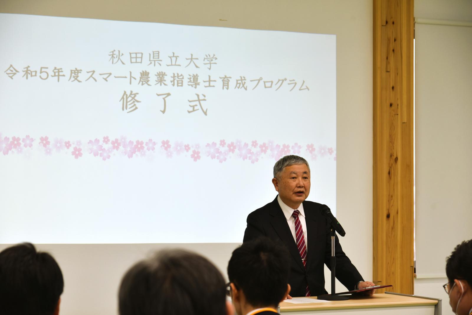 福田裕穂学長は、「国をあげてスマート農業を推進している中で、AICでも先端技術の開発と、技術者の育成を目指している。この1年間、農業技術を学びスマート農業指導士となった皆さんを通して、県内各地へそのノウハウを展開いただけることを願っている。」と開会の挨拶をしました。