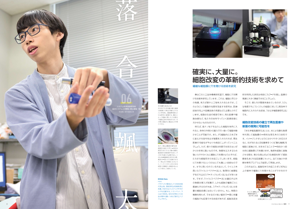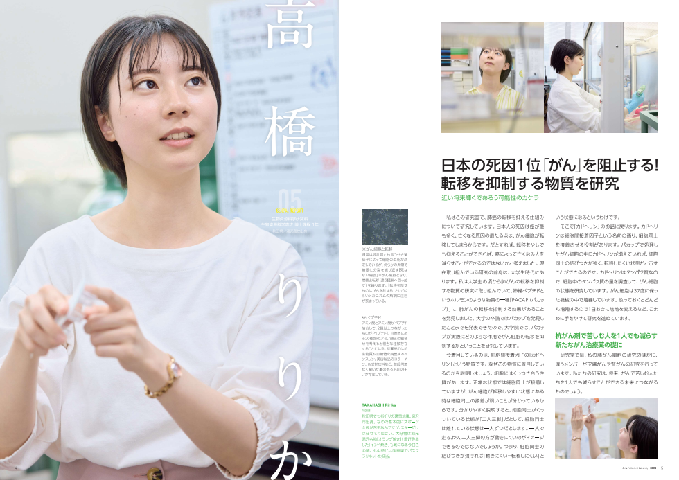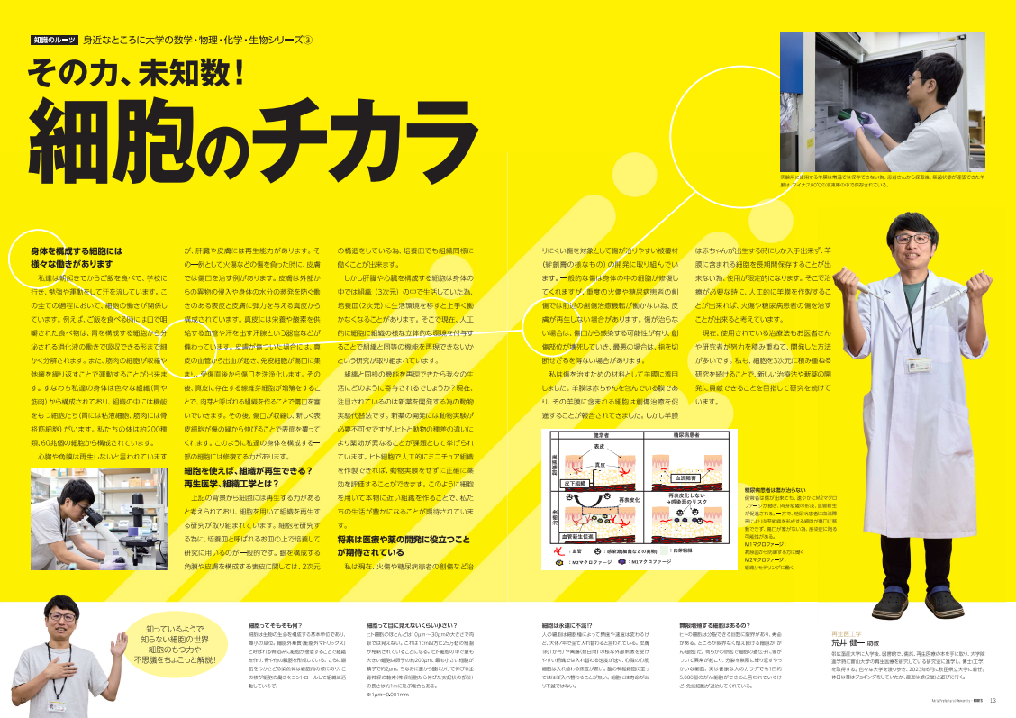 画数はそれほど多く無いが、とても重みのある二文字。学問の分野に応じてそれぞれの生命観があり、様々な意味合いがある。今回は「人間の寿命」を脅かす病に、生物学と工学の分野から、細胞レベルでのアプローチで医療という領域への可能性を見いだそうと研究を続ける、2人の先輩の起源に迫ります。身近なところに大学の数学・物理・化学・生物シリーズ
