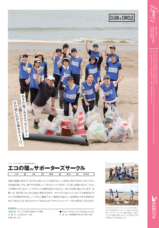 キャンパス周辺の海岸のゴミ掃除を定期的に実施しています。高校生の皆さん、秋田県立大学で地球のためにできることを、私たちと一緒にやってみませんか!?サークルメンバー一同、お待ちしております!