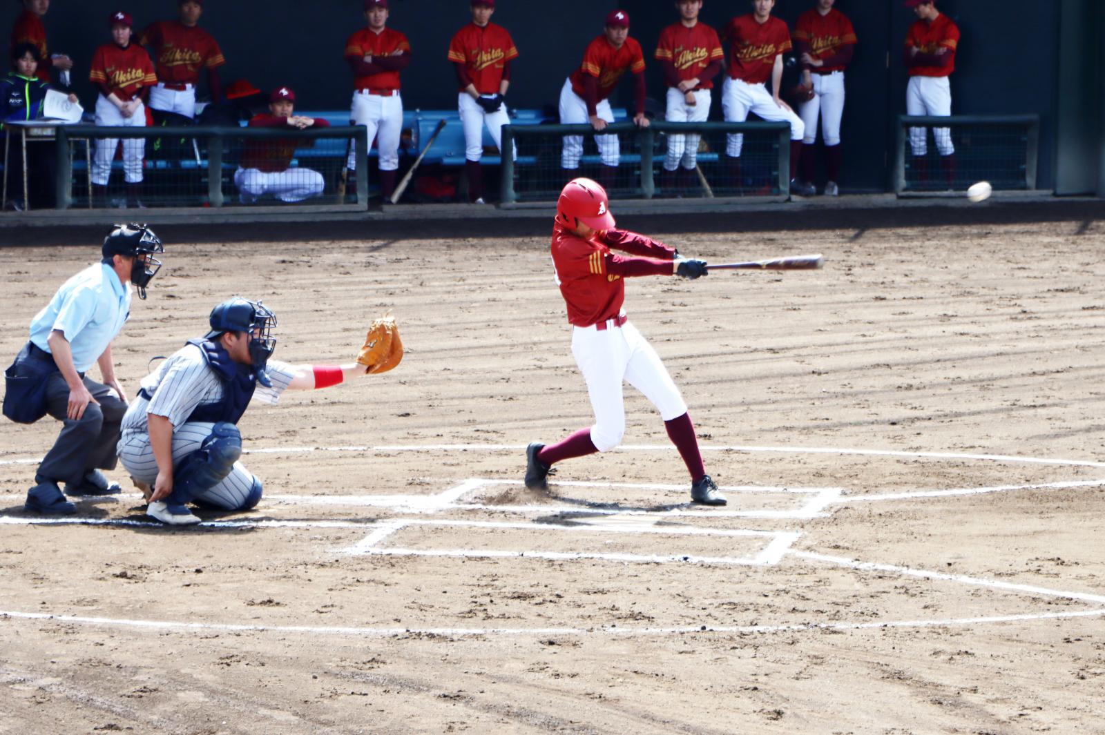 現在、硬式野球部は選手18人、マネージャー2人で活動しています。主に毎週土曜日、日曜日、秋田キャンパス野球場で練習に励んでいます。大会は主に北東北連盟が主催する春季リーグと秋季リーグ、さらには大館ドーム大会に参加しています。今後の目標は北東北大学野球リーグ戦で2部に昇格することを目指してします。これまで、主に部員不足ということもあり、思ったような結果を残すことができていませんでしたが、今年は新入部員も増え、マネージャーも入ったこともあり、今まで以上に真剣に練習に取り組んでいます!!2部に昇格するためには、まず3部リーグ戦で優勝して、2部の最下位のチームと入れ替え戦を戦い、勝利する必要があります。そのため、一戦一戦、勝ちにこだわり、一生懸命練習に励んでいきます!!部員1年生から4年生まで、みんなとても仲がよく、雰囲気の良いサークルです。部員の中には大学から野球を始めたり、女子でも選手として頑張っている部員もいます。部員さらにはもマネージャーも大募集していますので、是非お気軽に入部を検討してみてください!!