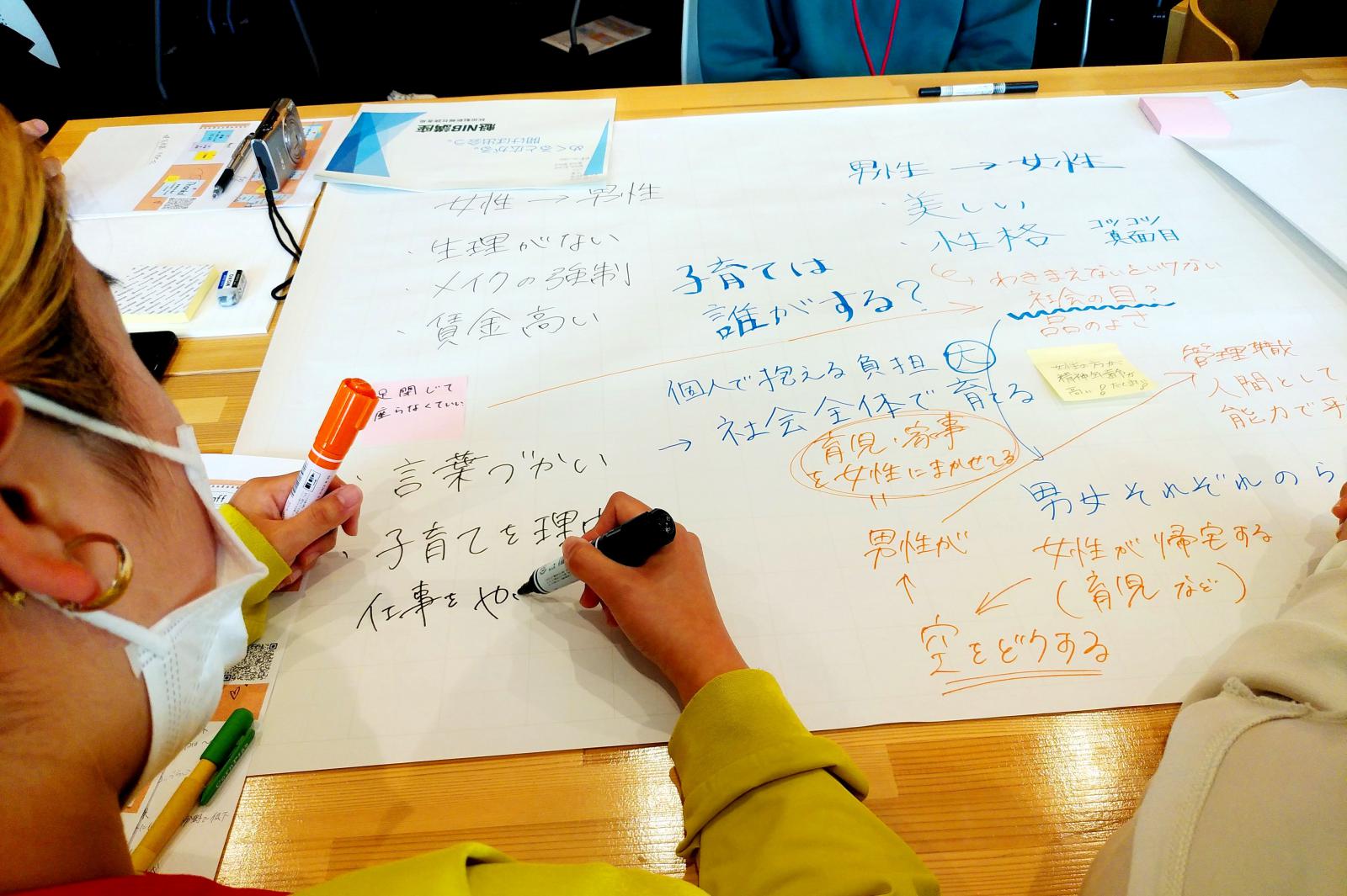 当日は、本学学生のほか一般市民10名が参加し、『固定観念を探してみよう』をテーマに意見交換しました。ジェンダーに関する話し合いでは、男性と女性がお互いにうらやましいと思うところについて話し合ったり、理想の働く環境について自由に討論したりしながら、固定観念や偏見について考えました。「女性は家事ができるという印象を持たれているのがつらい」「トップダウンではなく、みんなで話し合える企業が理想」など、様々な意見が出されました。