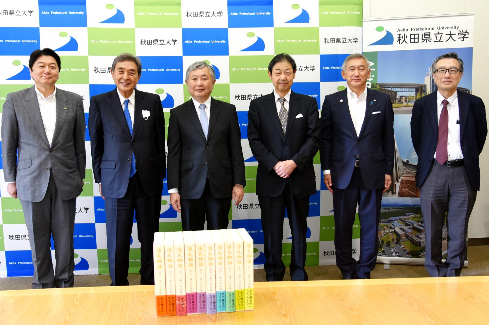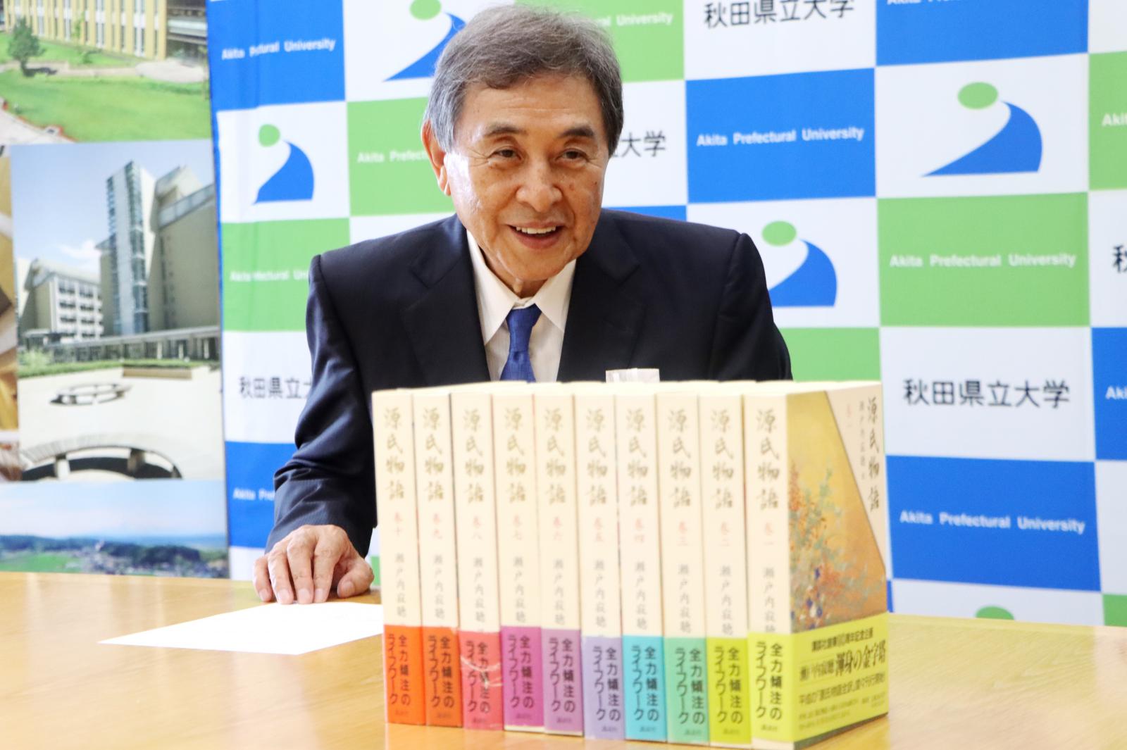 この度、「瀬戸内寂聴師を偲ぶ会」様より、2021年に99歳で亡くなった瀬戸内寂聴さんが現代語訳を行った「源氏物語」10巻を本学にご寄贈いただき、6月13日(木)、秋田キャンパスにて寄贈式が行われました。寄贈式には、瀬戸内寂聴さんが長年、住職を務められた天台寺のある岩手県旧浄法寺町(現在の二戸市)の元町長で同会の山本均会長と、同会顧問の猿田秋田県副知事にご臨席いただき、本学の福田裕穂学長へ目録が贈呈されました。