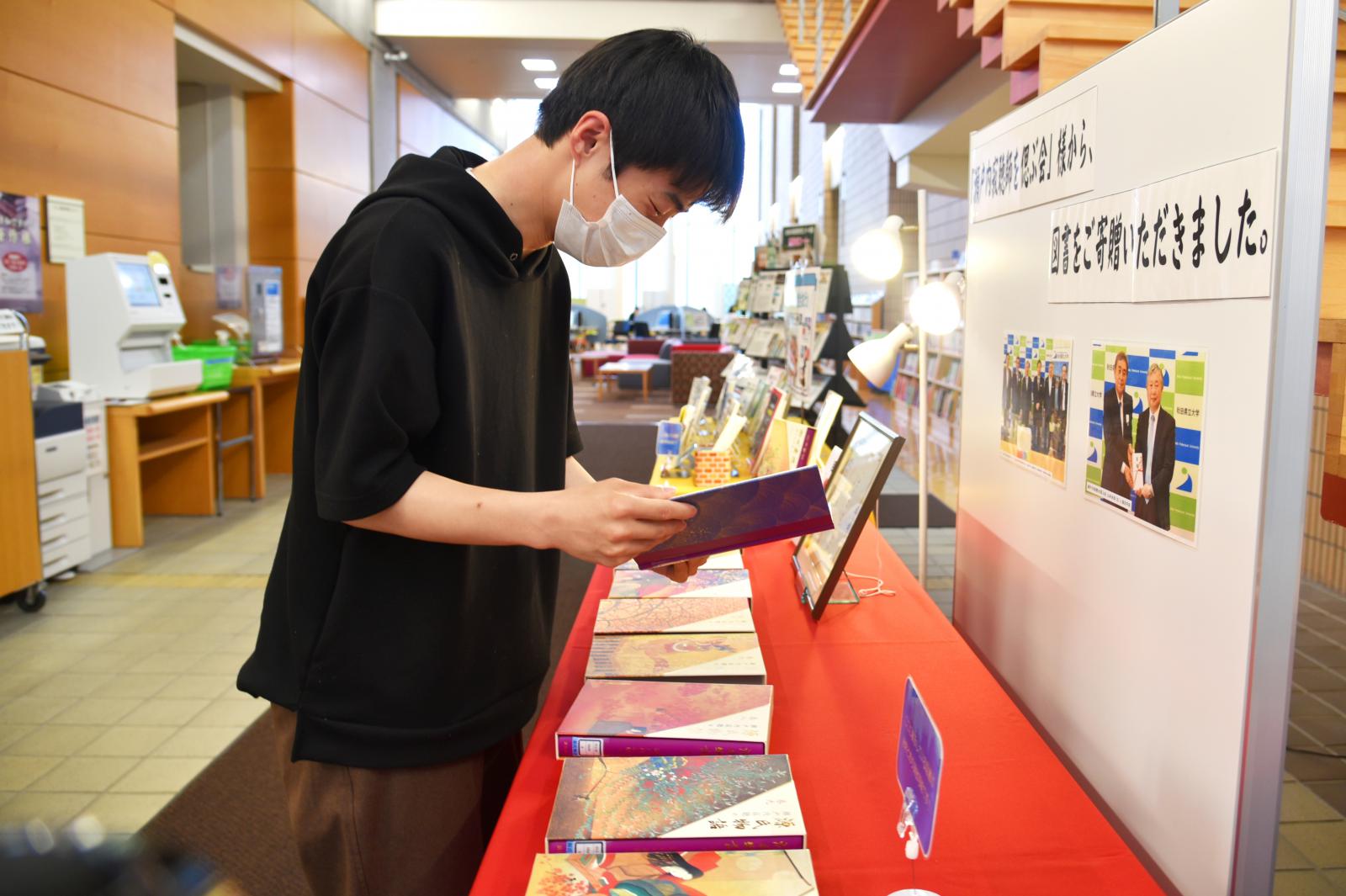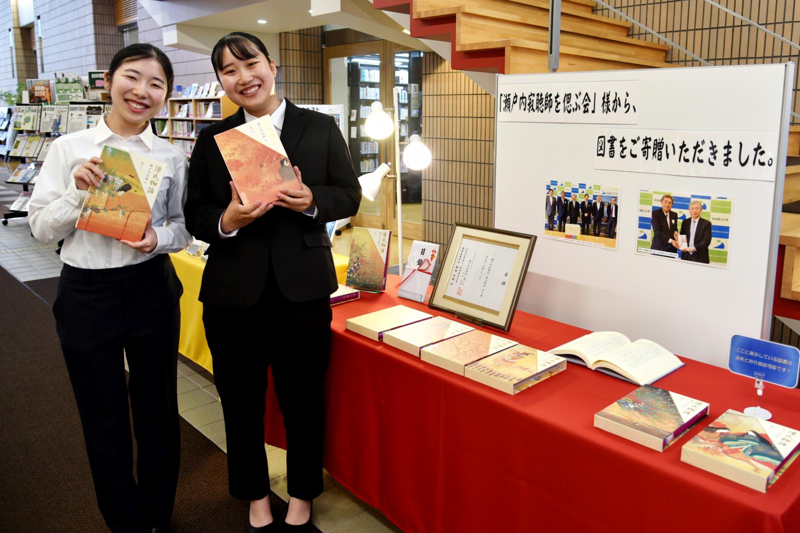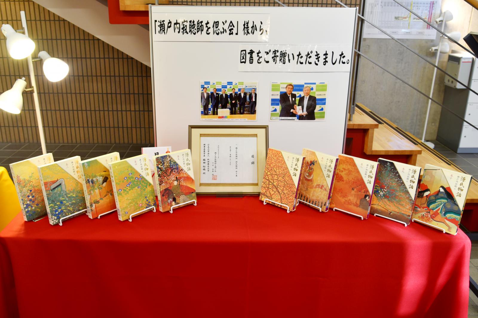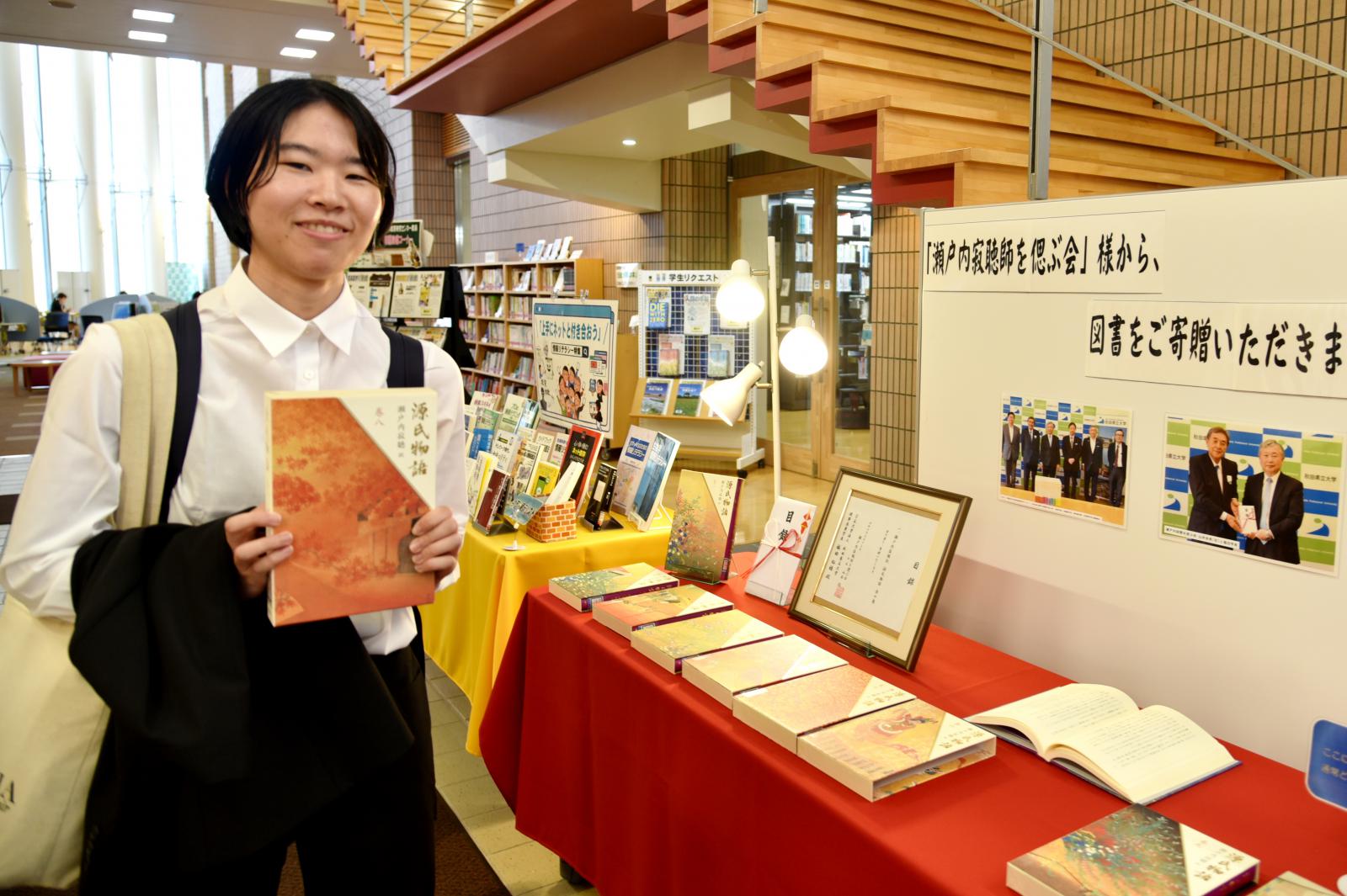今回寄贈いただきました本は、秋田キャンパス図書館内に「源氏物語」特設コーナーを設け、翌日14日より展示を開始したところ、多くの学生が立ち寄って本を手にとる姿が見られました。