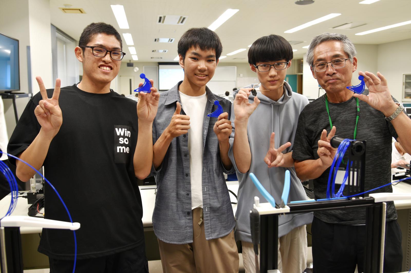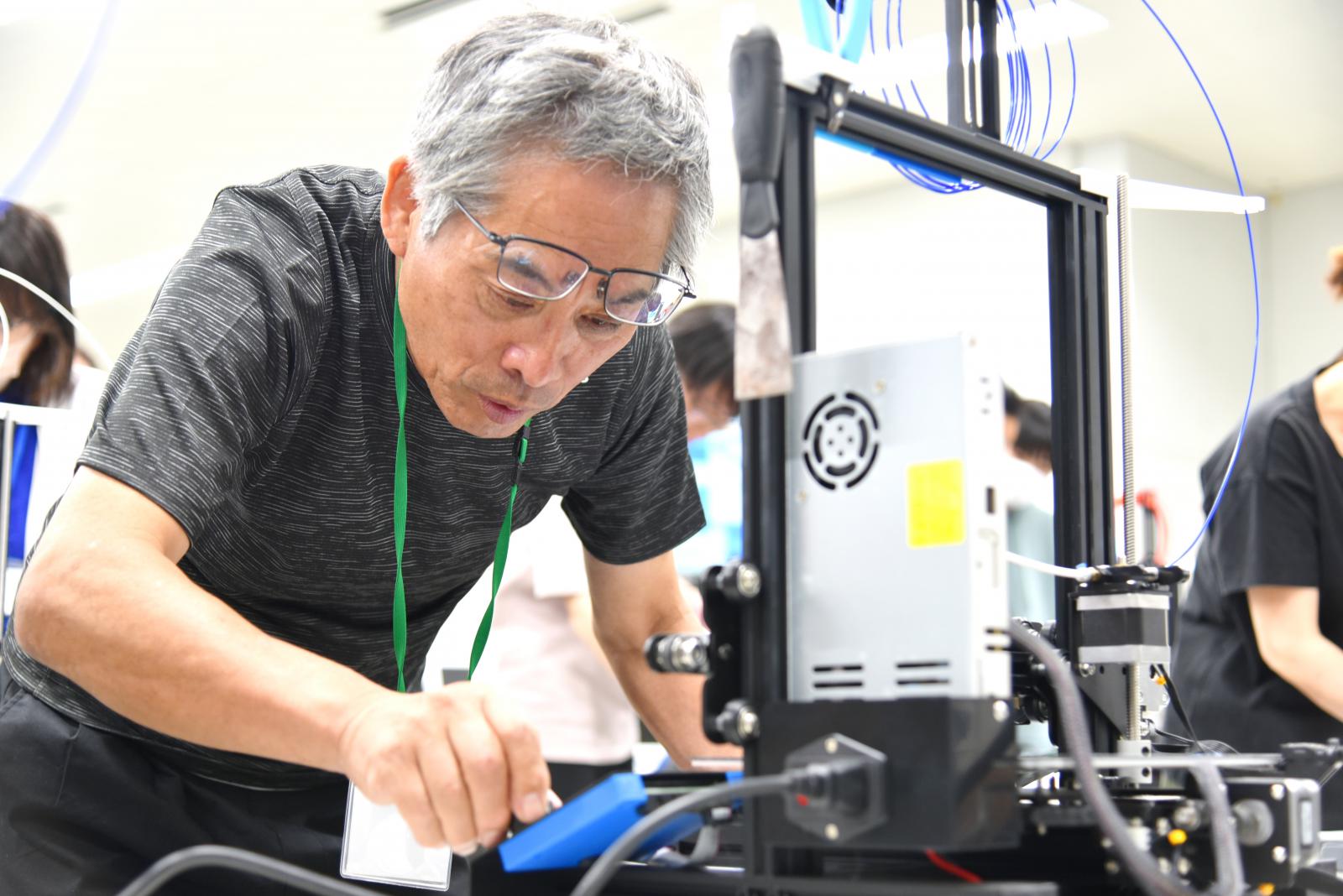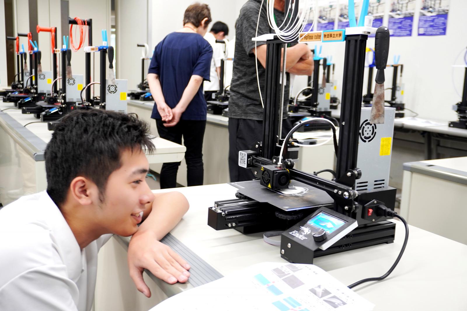 第4講の「3Dプリンターで作るとしたら?」では、3Dプリンターの仕組みや機能について学び、実際に3Dプリンターで秋田県立大学のロゴマークを造形・出力してみました。3Dプリンターが動き出すと、参加した皆さんの目は3Dプリンターの動きに釘付けになり、完成したときには拍手や歓声が上がり、初めて自分で3Dプリントした作品を手に取ると達成感が溢れていました。