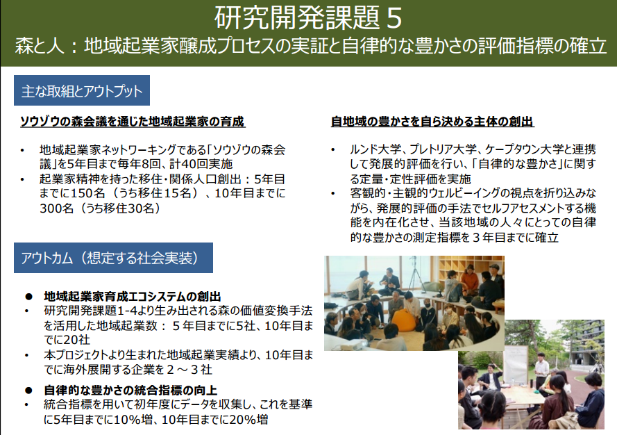 【研究開発課題5】(森と人)地域起業家醸成プロセスの実証と自律的な豊かさの評価指標の確立