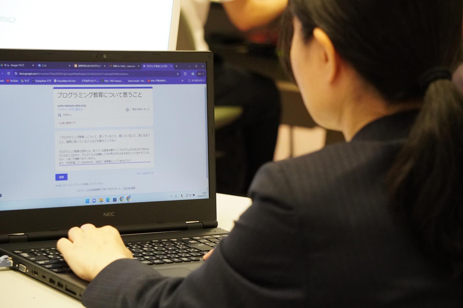 7月1日(月)、秋田県総合教育センターにおいて、高等学校教員向け研修『高等学校におけるプログラミング』が開催され、システム科学技術学部情報工学科の廣田千明准教授が講師を務めました。まずはじめに、機械学習の学習に最適なプラットフォームでブラウザから Python を記述・実行できるサービス「Google Colaboratory」の使い方を学び、変数を用いた簡単なプログラムを作成しました。次に、条件分岐や繰り返しといった基本的なPythonの文法を実例を基に学びました。最後に今年度の大学入学共通テストから実施される情報Ⅰのサンプル問題を基にしたプログラムのデモンストレーションを体験し、プログラミングが社会に広く活用できることを実感しました。