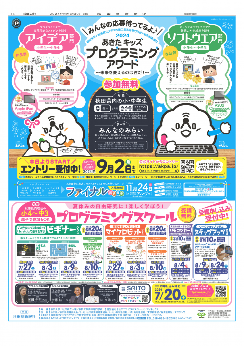 秋田魁新報社(主催)・秋田大学・秋田工業高等専門学校・秋田県立大学で共催する『あきたキッズプログラミングアワード』が今年も開催されます!詳細・エントリーはこちら!→ https://akpa.jp/
