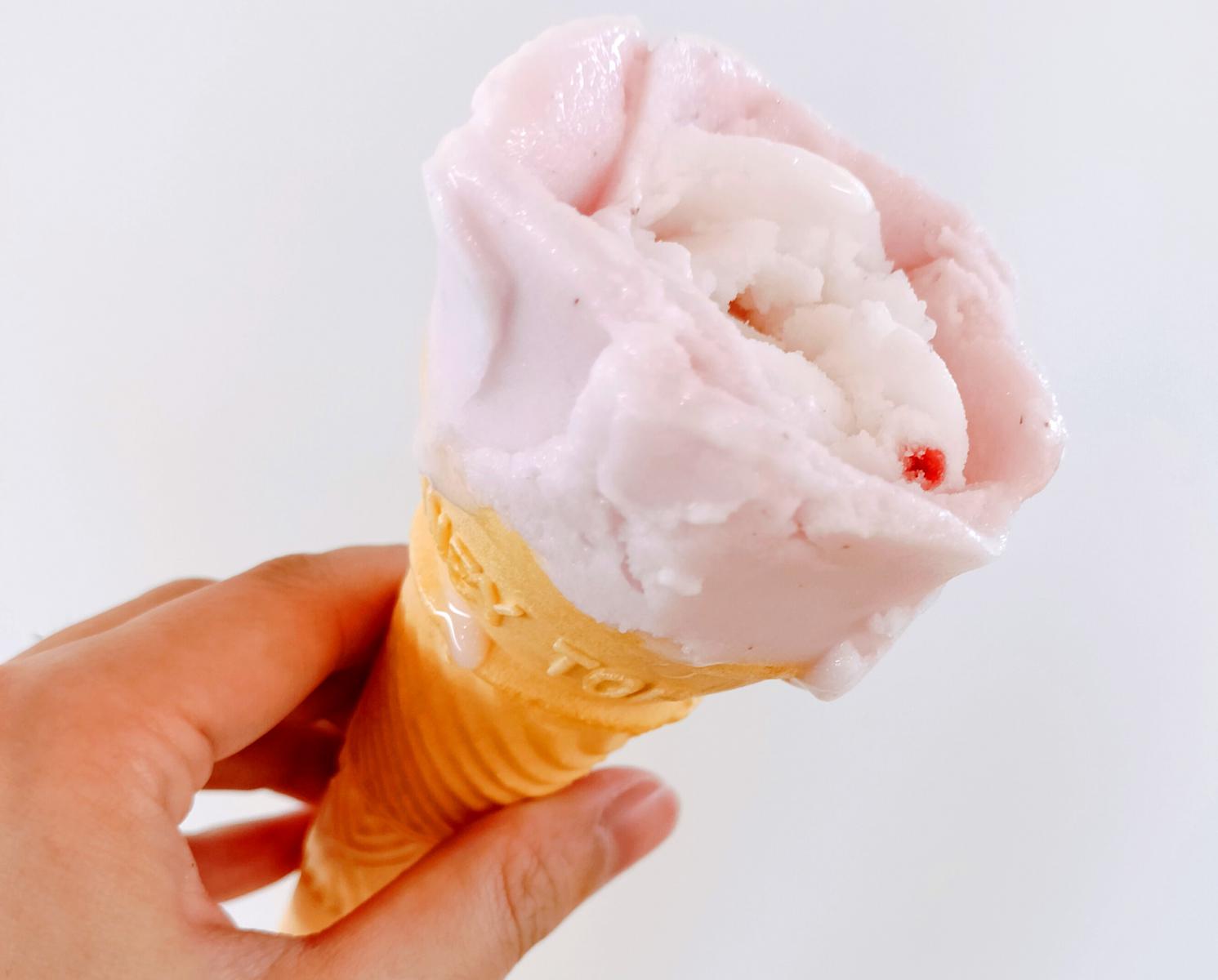 2月から本格的にメニューの開発に取り組み、アイスの材料にはアグリイノベーション教育研究センター産のラズベリー2種類を使用しました。黒ラズベリーはつぶつぶ感を残した食感、赤ラズベリーは甘酸っぱい風味が広がり、見た目も可愛らしく、ラズベリーの果肉の口当たりも楽しめるアイスが完成しました。
