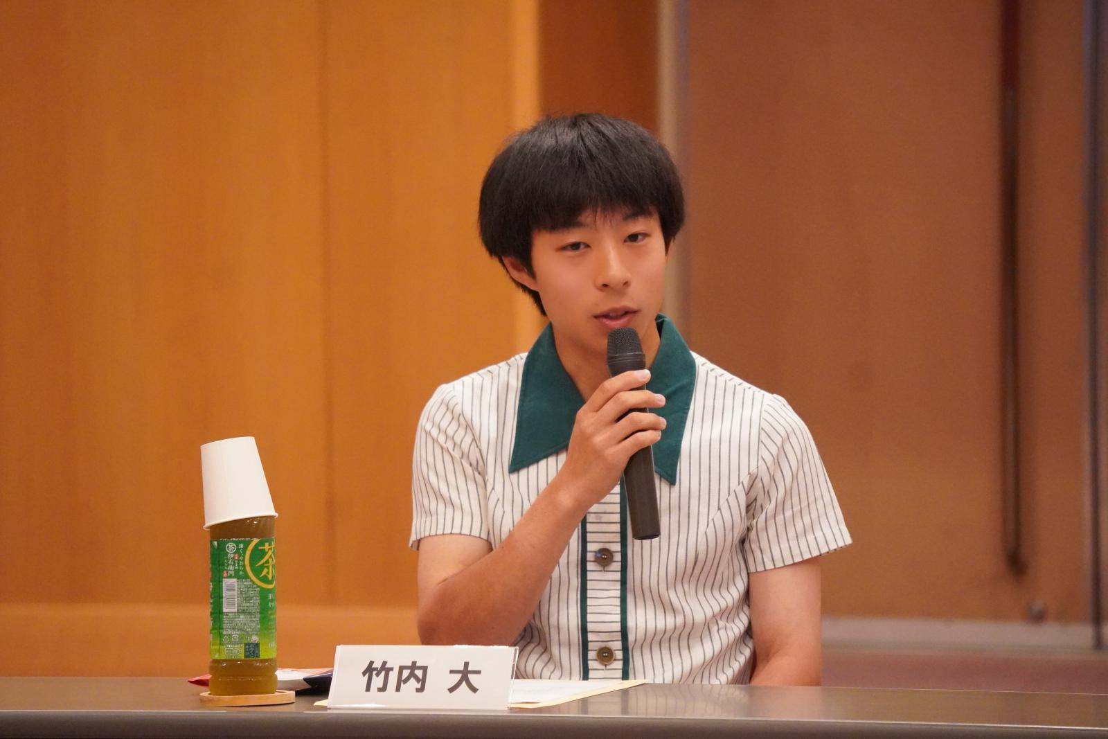 7月10日(水)に、ノースアジア大学において、秋田地域振興局が主催する「知事と県民の意見交換会」が開催され、本学からは、生物資源科学部アグリビジネス学科4年の竹内大さんが参加しました。「これからの社会、これからの秋田」をテーマに、県内5つの大学から5名の学生が参加し、佐竹敬久秋田県知事と意見交換を行いました。学生たちは、各々の大学で学修している分野の知識を絡めた意見を出し合いました。参加した学生は県外出身者が多く、秋田に来て感じた秋田の魅力や、秋田の将来に自身がどのように関わっていきたいか、などの意見を発表しました。