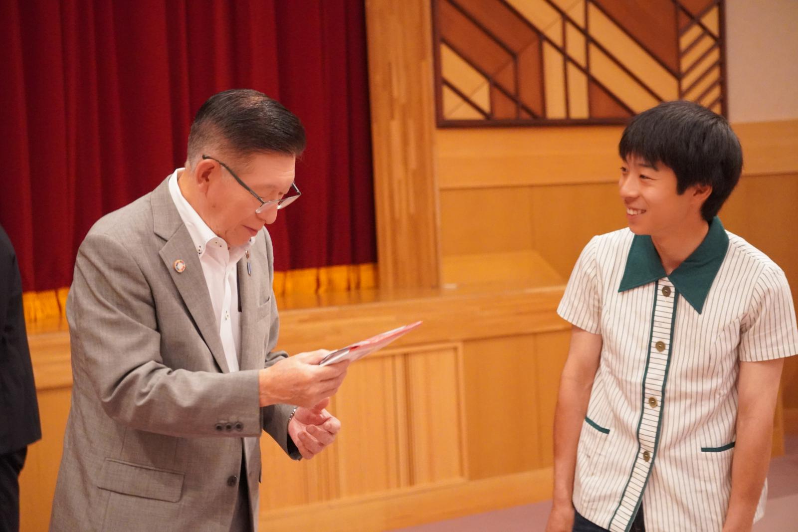 竹内さんは、「自分が秋田の方と関わって感じた人の温かさを、秋田に訪れた方に伝えたい」「地域や農村のコーディネートをし、秋田の魅力を発信しつつ、理想の田舎暮らしに近づけていきたい」といった意見を述べました。また、竹内さん自身が開発に携わった、米粉を使ったラムネ菓子「こめらむね」を佐竹知事にお渡しする場面もみられました。