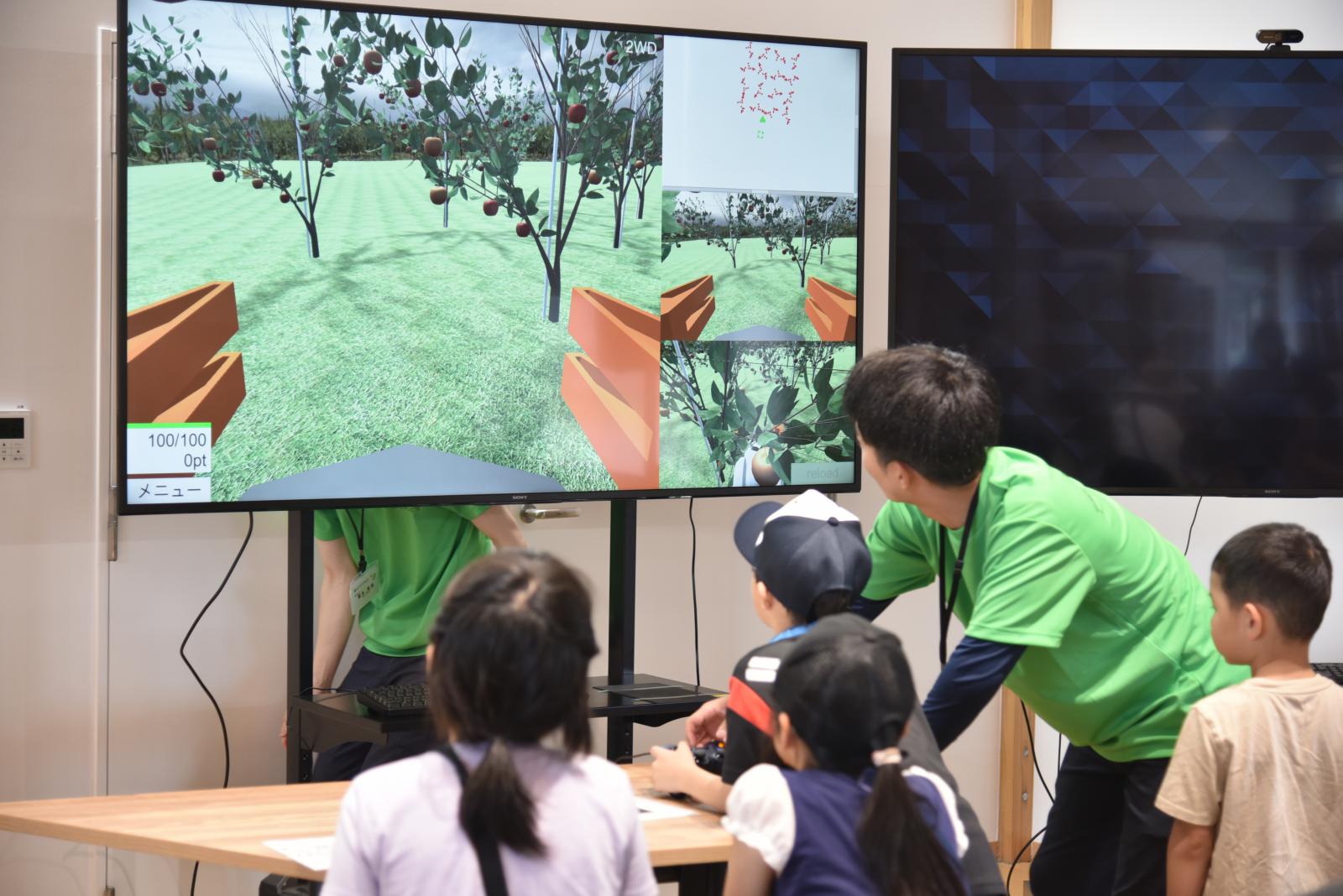体験コーナーでは、仮想空間でのリンゴ収穫体験、ドローン操縦体験、遠隔操作での草刈り体験が実施され、様々なスマート農業技術に触れていただきました。また、屋外には、トラクター、自動田植え機、コンバインなど、農業の省力化・軽労化に貢献する様々な農業機械の乗車体験が行なわれました。スマート農業講演会では、知能メカトロニクス学科の齋藤直樹教授が「農作業を軽労可するアシストウェア」というタイトルで、また、アグリビジネス学科の吉田康徳教授が「ここまで来た!!果菜類収穫ロボット」というタイトルでそれぞれ講演を行いました。