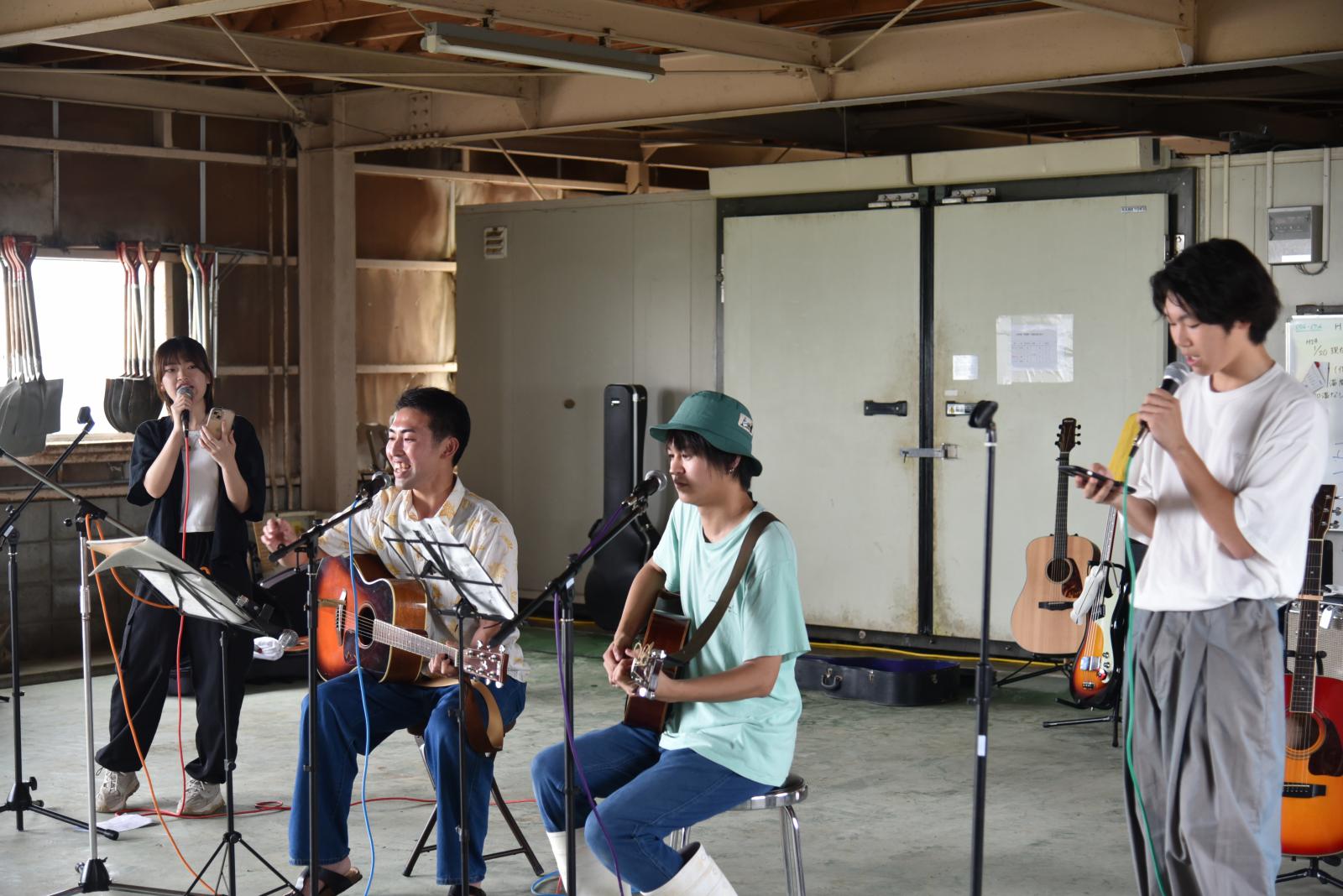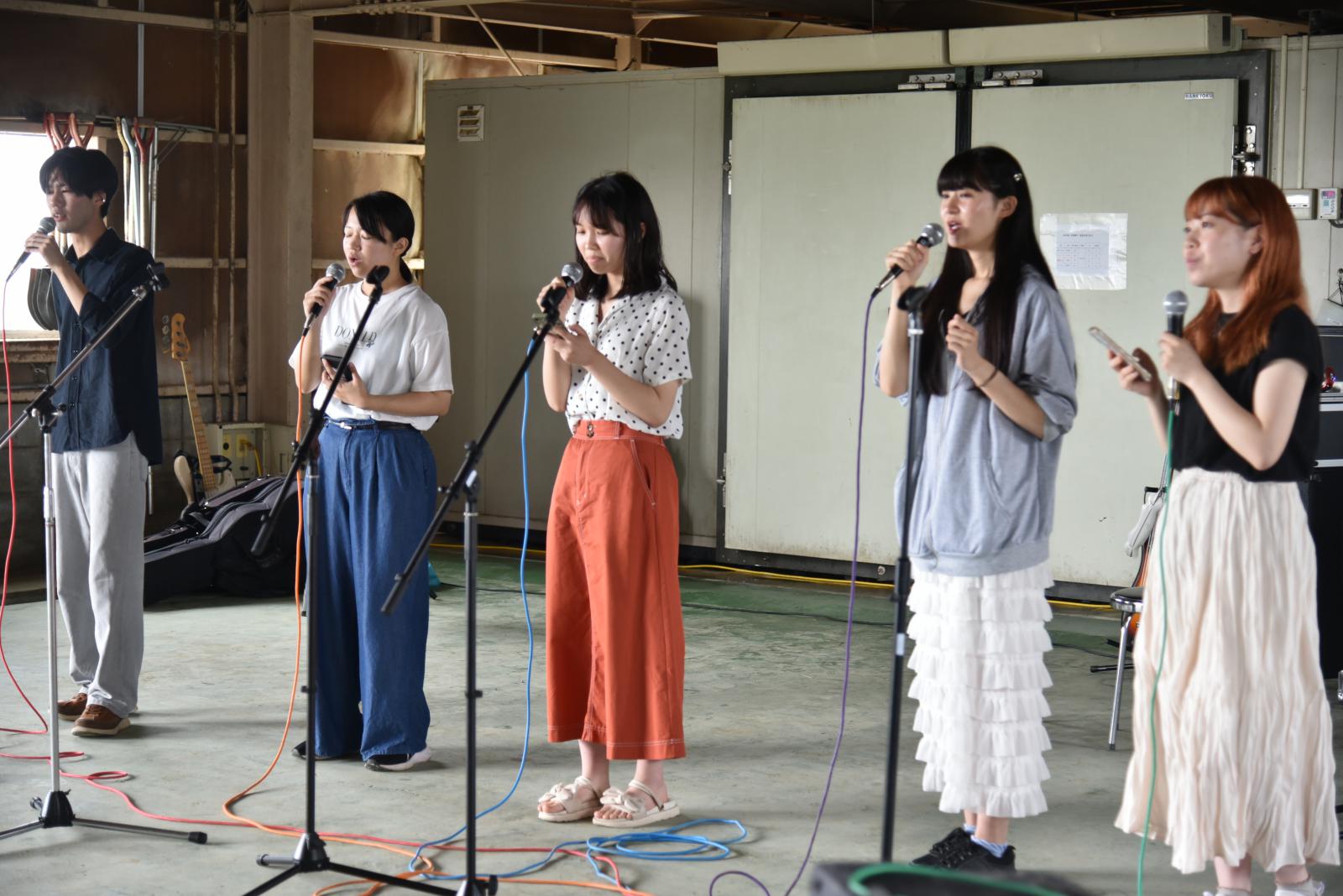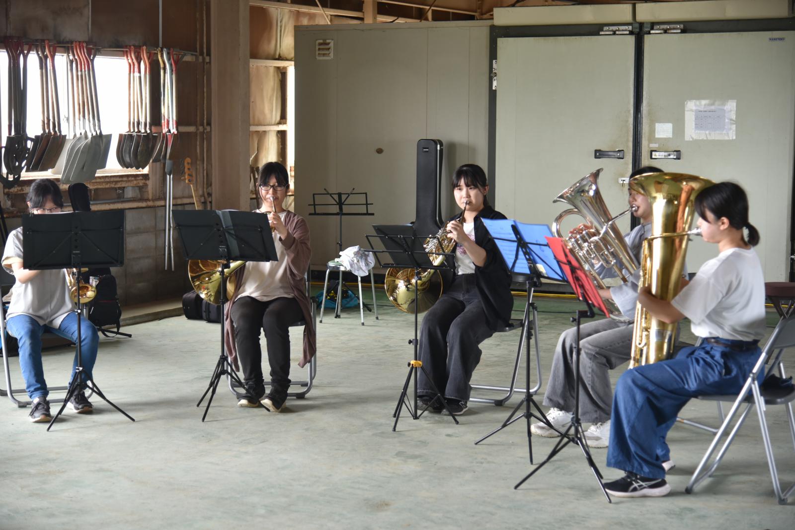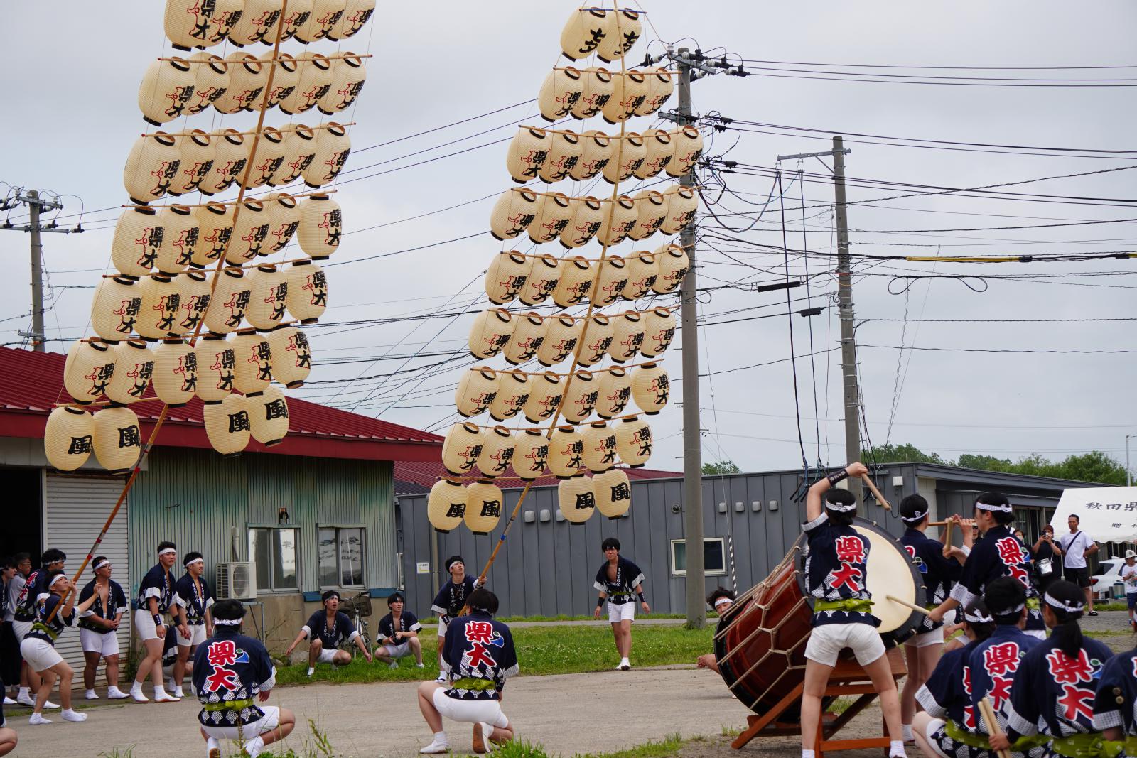 この日は風が強く、竿燈(大若2本)を上げるには難しいコンディションでしたが、うまくバランスをとって妙技を披露する県大竿燈会の差し手の姿に、大きな拍手と歓声が沸き起こっていました。作物作業舎では、県大音フェスが開催され、本学の学生団体、アコギサークル、アカペラサークル、アンサンブルサークルが演奏を披露しました。また牛舎では、牛とのふれあいイベントが実施され、子牛とのふれあいやエサやりを体験しました。