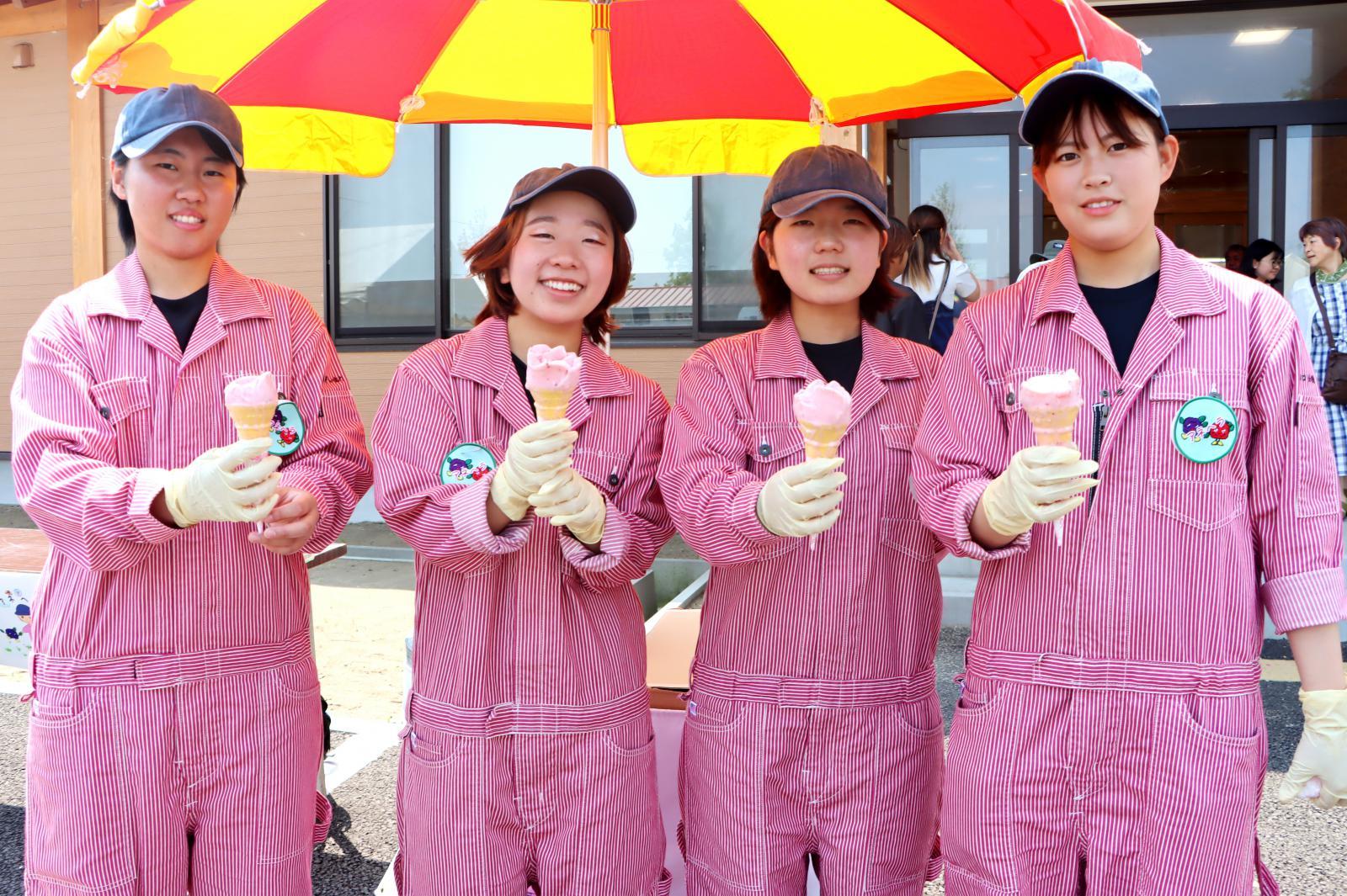 AIC産キャベツ・トマトや鉢花、短角牛などが販売され、午前10:00の開始直後から大盛況となりました。また、様々な作物栽培を手掛ける本学学生団体「SAT」が生地から作ったピザが提供され、こちらも行列ができるほど大人気でした。さらに、㈱児玉冷菓×県大生とのコラボ商品で、研究・実習用にAIC圃場で栽培しているラズベリーを使用したアイス「アネヘラ」も販売され、用意した約300食は完売となりました。