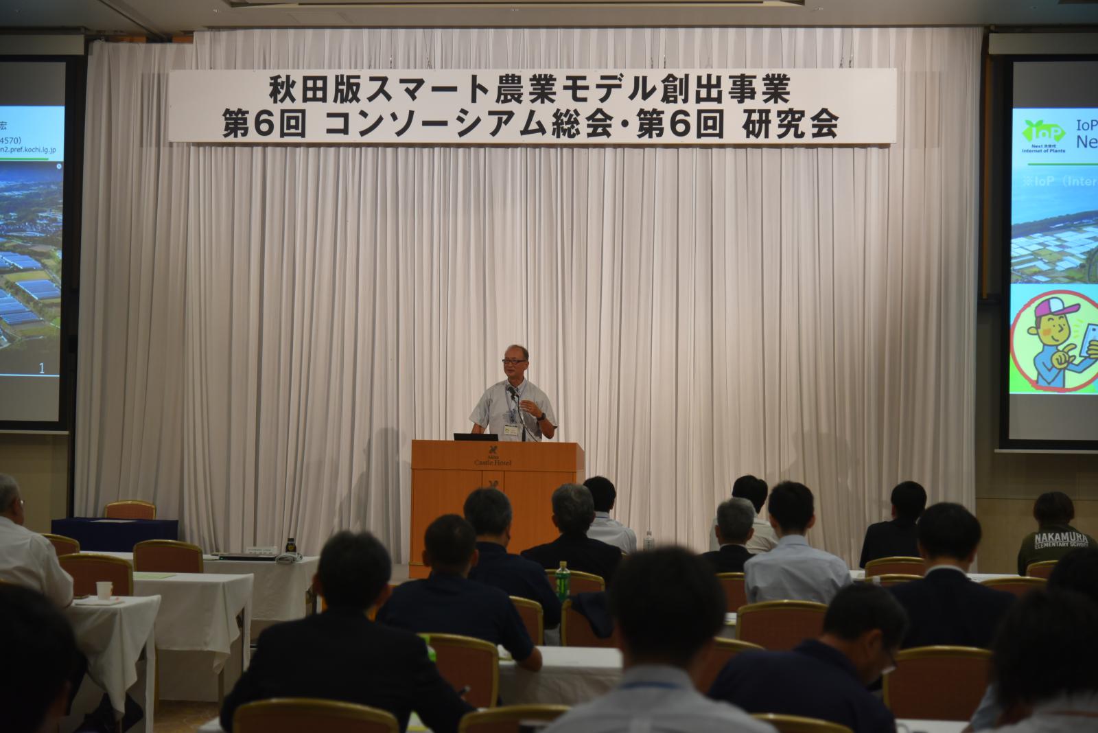 7月12日(金)、秋田キャッスルホテルにて、「秋田版スマート農業モデル創出事業コンソーシアム 第6回研究会」を開催し、コンソーシアム会員など約100名が参加しました。