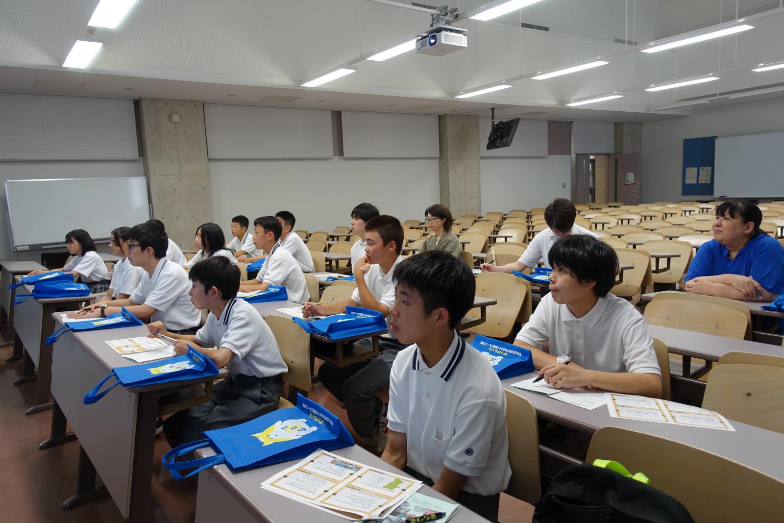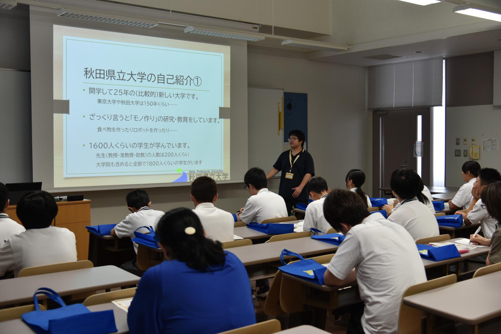 始めに、秋田県立大学の概要説明、特徴、サークル紹介などが行われました。中学校との違いや、大学の授業構成や仕組みを理解している様子が見られました。生徒の方から積極的に質問する姿も見られ、有意義な時間を過ごしました。