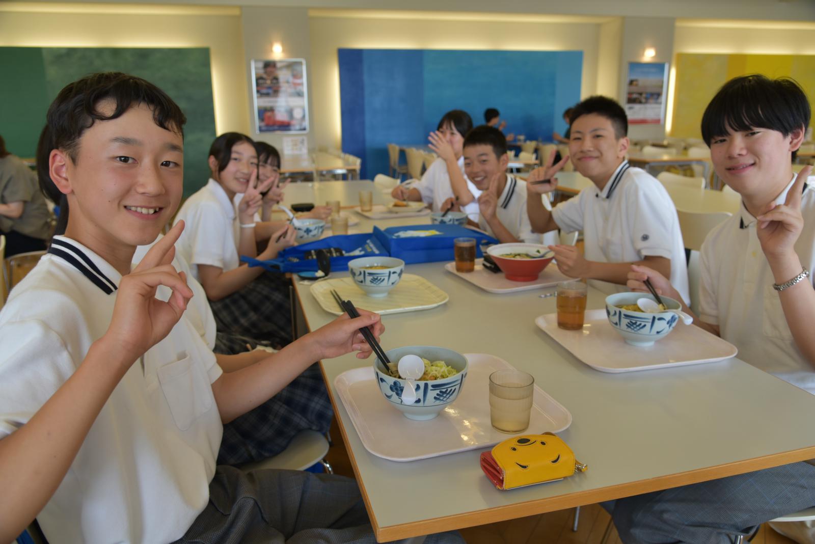 その後、カフェテリアにて、昼食体験を行いました。初めての学食に、「給食よりおいしい」などの声が上がり、楽しく食事しました。