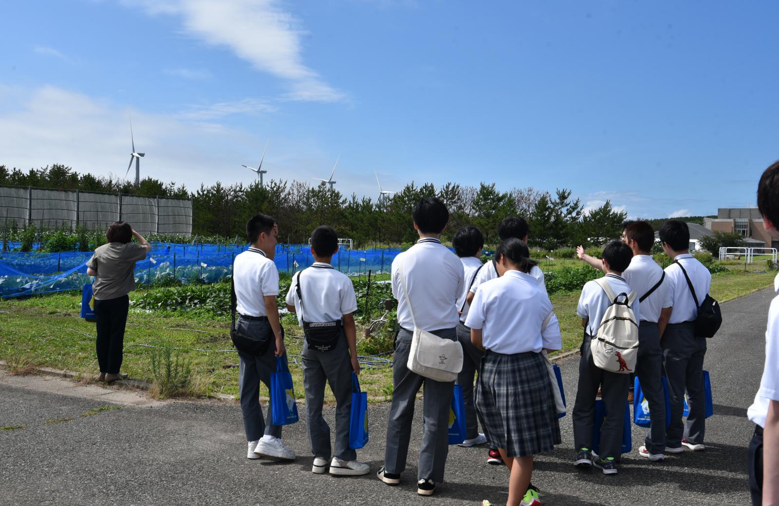 施設見学では、エントランスを抜け、学部棟、図書館、体育館、圃場を中心に学内を回りました。図書館では、学術誌や館内の特設コーナーなど、中学とは異なる点に興味を持っていた様子でした。日差しの強い中、広大な敷地内を見学しました。