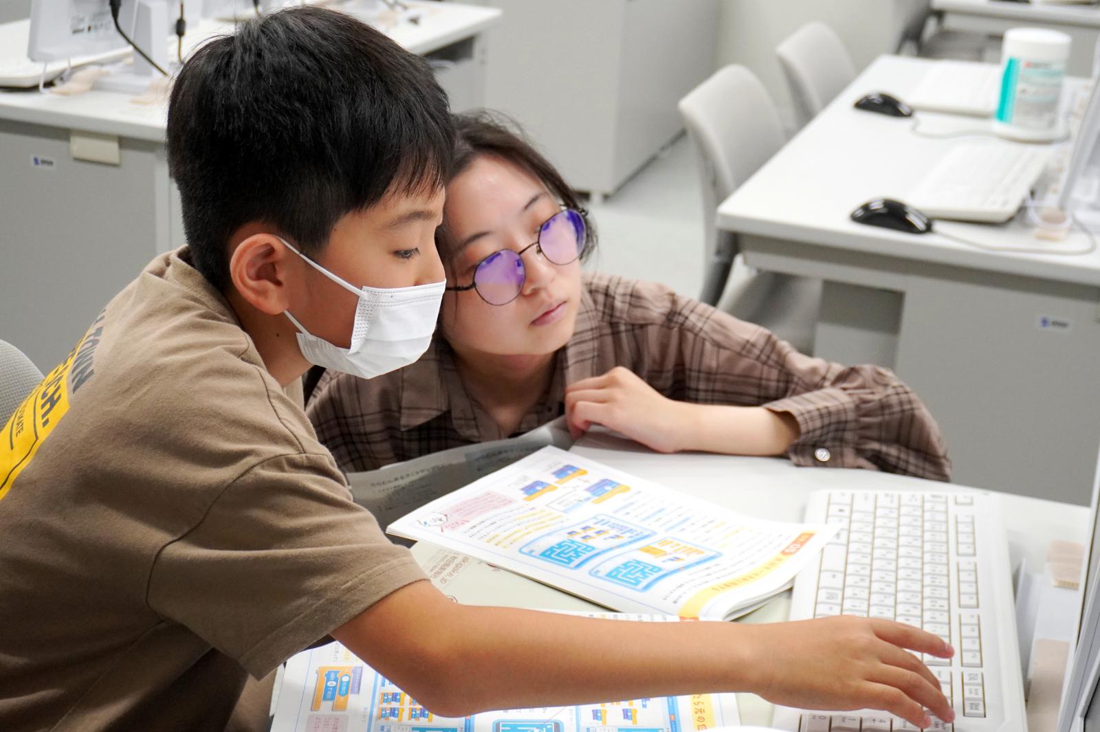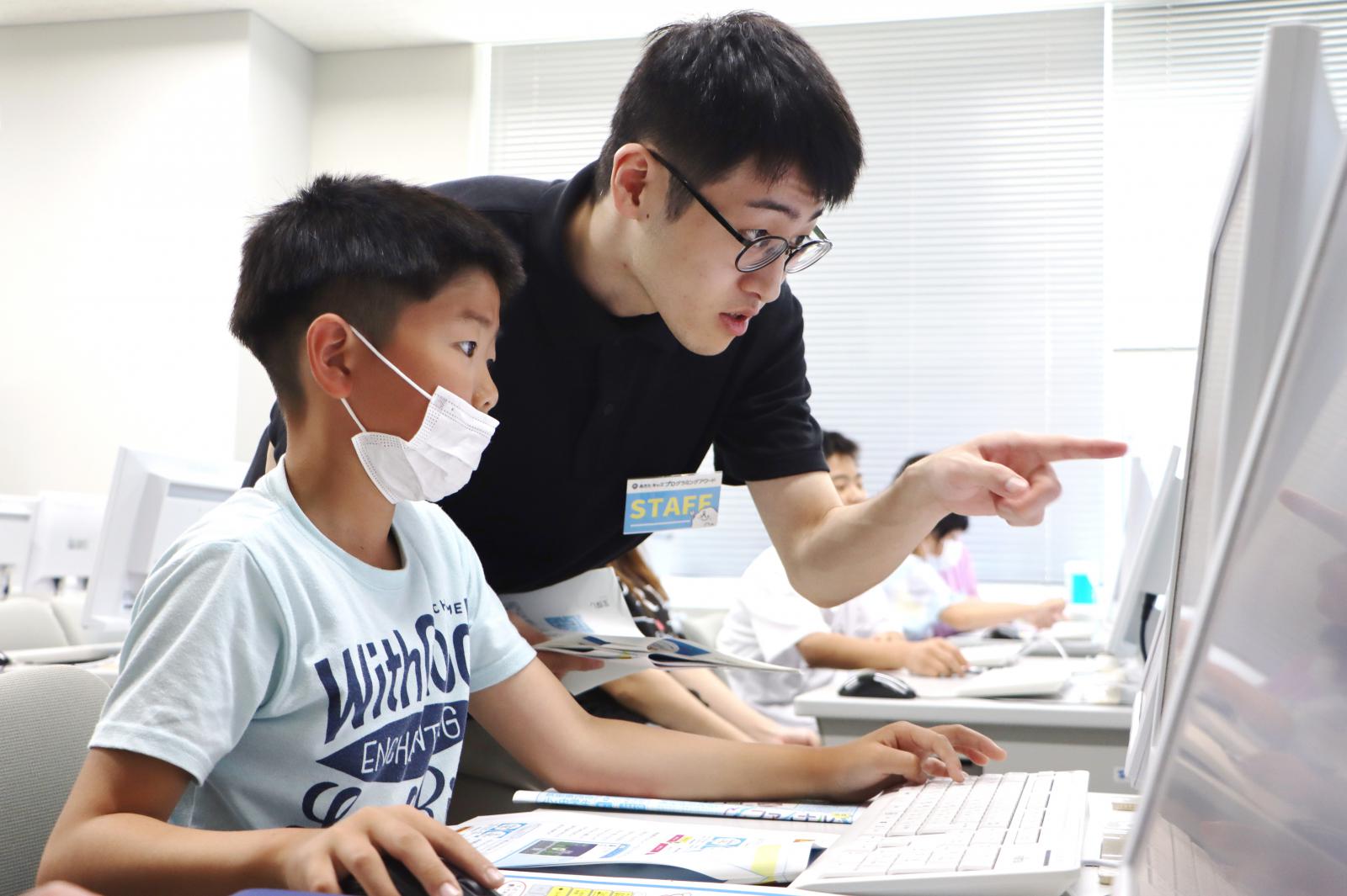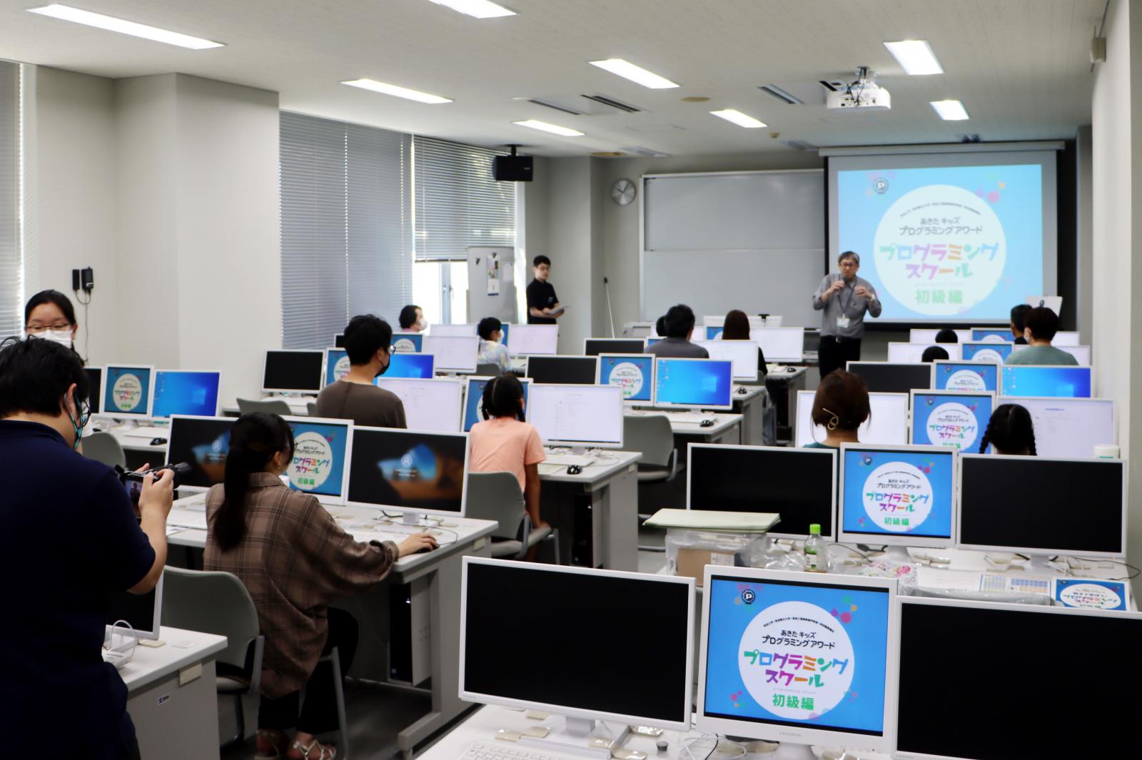 秋田魁新報社が主催、秋田県立大学、秋田大学、秋田工業高等専門学校が共催する「あきたキッズプログラミングアワード2024」の一環として、8月3日(土)、システム科学技術学部/情報工学科の廣田 千明 准教授[専門:応用数学]が講師を務める、親子でプログラミングを学ぶ「プログラミングスクール」が開催され、小中学生および保護者の17名が参加しました。午前の部「Scratchで基本を学ぶビギナークラス」Lesson1では、子ども向け教材「スクラッチ」を使い、竿燈の差し手に扮ふんしたオリジナルキャラクター「ぐらむん」を画面上で動かすプログラムの作成に取り組みました。「端に着いたら跳ね返る」など指示通りにキャラクターが動くと、子どもたちは満面の笑みを見せていました。Lesson2では、迷路の中で宝箱を探すゲーム作りにも挑戦し、本学教員や学生スタッフのアドバイスを受けながら当たりとはずれの箱を設定しました。